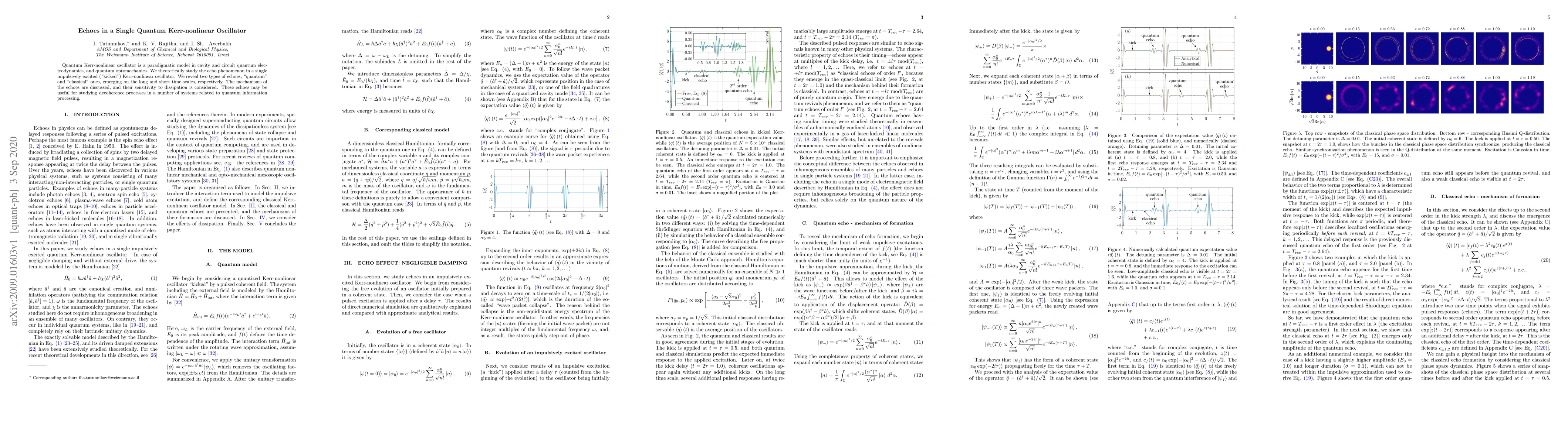 Quantum Kerr-nonlinear oscillator is a paradigmatic model in cavity and circuit quantum electrodynamics, and quantum optomechanics. We theoretically study the echo phenomenon in a single impulsively excited ("kicked") Kerr-nonlinear oscillator. We reveal two types of echoes, "quantum" and "classical" ones, emerging on the long and short time-scales, respectively. The mechanisms of the echoes are discussed, and their sensitivity to dissipation is considered. These echoes may be useful for studying decoherence processes in a number of systems related to quantum information processing.