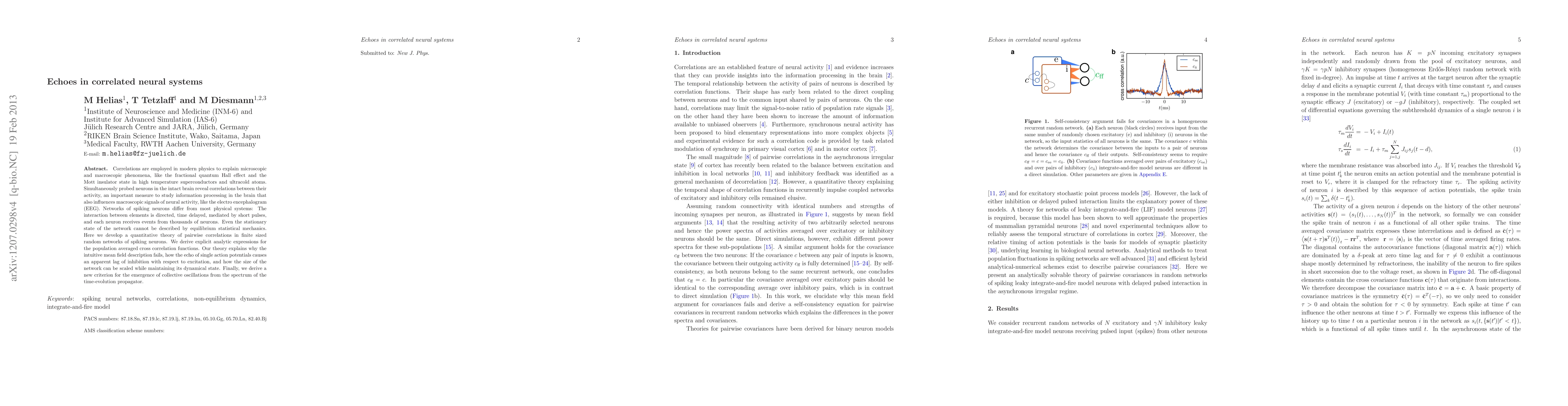 Correlations are employed in modern physics to explain microscopic and macroscopic phenomena, like the fractional quantum Hall effect and the Mott insulator state in high temperature superconductors and ultracold atoms. Simultaneously probed neurons in the intact brain reveal correlations between their activity, an important measure to study information processing in the brain that also influences macroscopic signals of neural activity, like the electro encephalogram (EEG). Networks of spiking neurons differ from most physical systems: The interaction between elements is directed, time delayed, mediated by short pulses, and each neuron receives events from thousands of neurons. Even the stationary state of the network cannot be described by equilibrium statistical mechanics. Here we develop a quantitative theory of pairwise correlations in finite sized random networks of spiking neurons. We derive explicit analytic expressions for the population averaged cross correlation functions. Our theory explains why the intuitive mean field description fails, how the echo of single action potentials causes an apparent lag of inhibition with respect to excitation, and how the size of the network can be scaled while maintaining its dynamical state. Finally, we derive a new criterion for the emergence of collective oscillations from the spectrum of the time-evolution propagator.