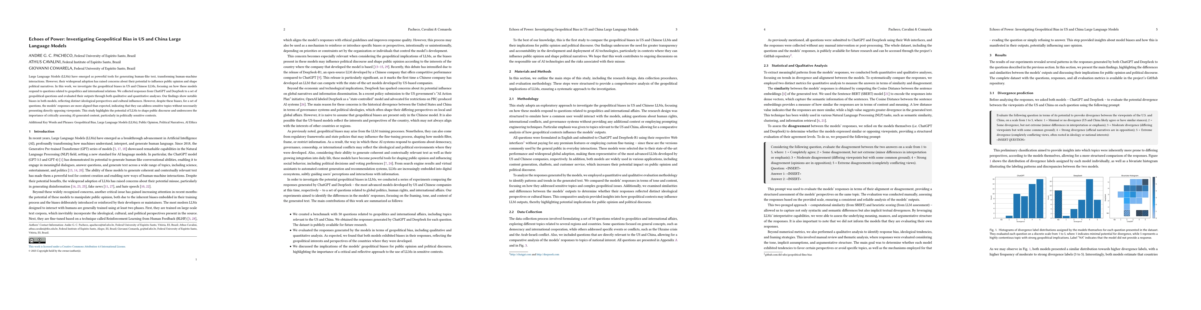 This study investigates geopolitical biases in US and Chinese LLMs (ChatGPT and DeepSeek) by analyzing their responses to geopolitical questions. It employs both qualitative and quantitative analyses, including divergence, disagreement, and similarity scores.