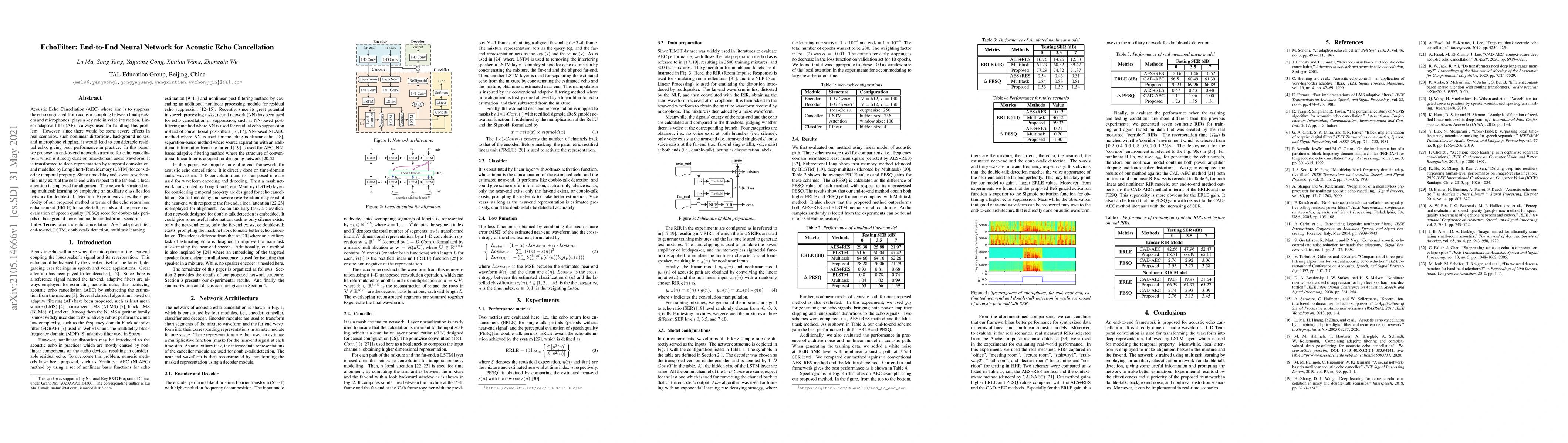 The paper proposes EchoFilter, an end-to-end neural network for acoustic echo cancellation that uses temporal convolution and LSTM to model time-domain audio, with local attention for alignment and multitask learning for improved performance. Experimental results show superior echo return loss enhancement and PESQ scores.