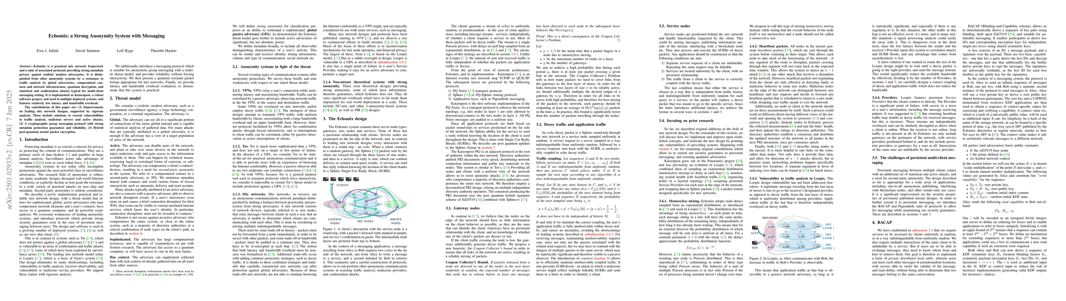 Echomix presents a mix network framework with associated protocols, offering strong metadata privacy, improvements over existing designs, a cryptographic group messaging protocol, and hybrid post-quantum nested packet encryption.