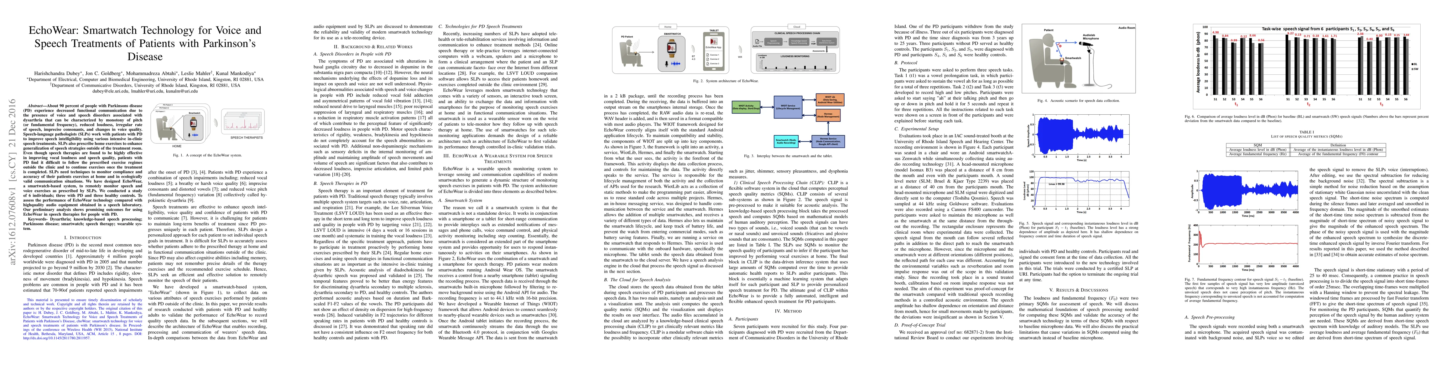 EchoWear, a smartwatch-based system designed to remotely monitor speech and voice exercises for patients with Parkinson's disease, shows promising preliminary results in improving speech intelligibility compared to high-quality audio equipment. The study highlights its potential to enhance compliance and accuracy in home speech therapy exercises.