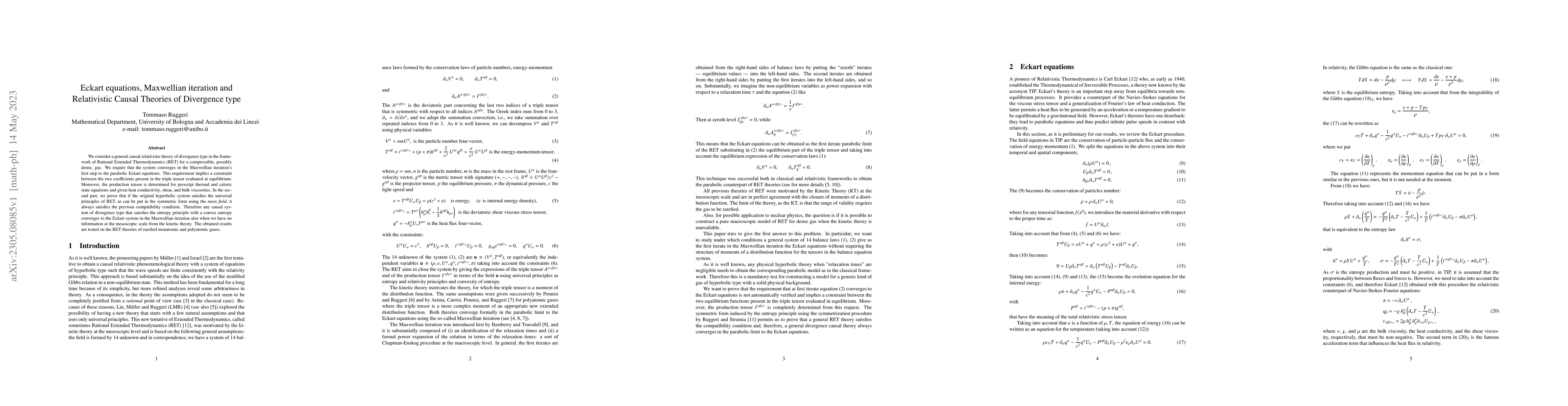 We consider a general causal relativistic theory of divergence type in the framework of Rational Extended Thermodynamics (RET) for a compressible, possibly dense, gas. We require that the system converges in the Maxwellian iteration's first step to the parabolic Eckart equations. This requirement implies a constraint between the two coefficients present in the triple tensor evaluated at equilibrium. Moreover, the production tensor is determined for prescript thermal and caloric state equations and given heat conductivity, shear, and bulk viscosities. In the second part, we prove that if the original hyperbolic system satisfies the universal principles of RET, as can be put in the symmetric form using the \emph{main field}, it always satisfies the previous compatibility condition. Therefore any causal system of divergence type that satisfies the entropy principle with a convex entropy converges to the Eckart system in the Maxwellian iteration also when we have no information at the mesoscopic scale from the kinetic theory. The obtained results are tested on the RET theories of rarefied monatomic and polyatomic gases.
