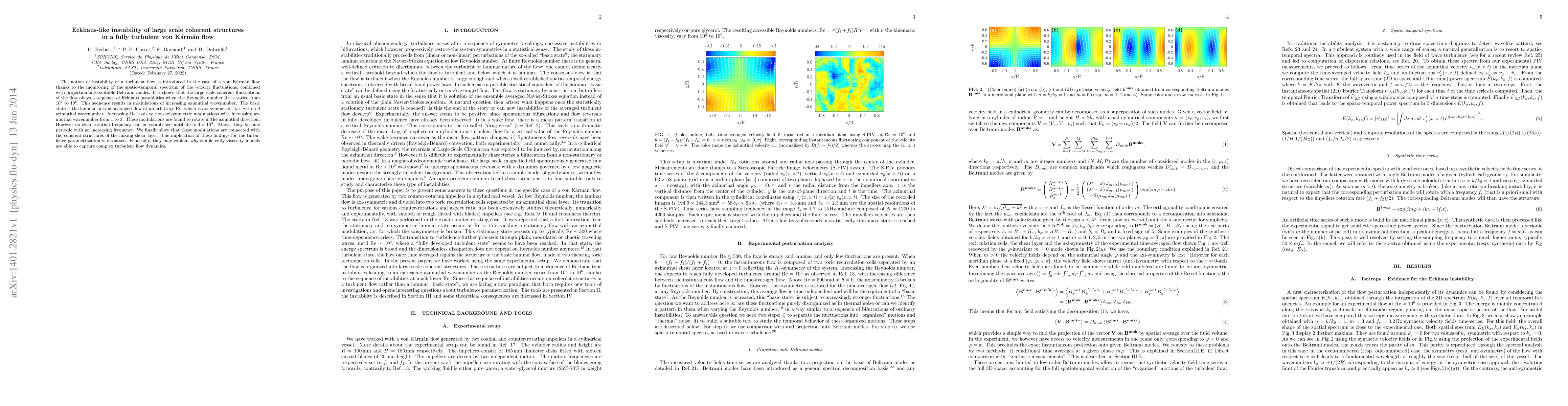 The notion of instability of a turbulent flow is introduced in the case of a von K\'arm\'an flow thanks to the monitoring of the spatio-temporal spectrum of the velocity fluctuations, combined with projection onto suitable Beltrami modes. It is shown that the large scale coherent fluctuations of the flow obeys a sequence of Eckhaus instabilities when the Reynolds number $\mathrm{Re}$ is varied from $10^2$ to $10^6$. This sequence results in modulations of increasing azimuthal wavenumber. The basic state is the laminar or time-averaged flow at an arbitrary $\mathrm{Re}$, which is axi-symmetric, i.e. with a $0$ azimuthal wavenumber. Increasing $\mathrm{Re}$ leads to non-axisymmetric modulations with increasing azimuthal wavenumber from $1$ to $3$. These modulations are found to rotate in the azimuthal direction. However no clear rotation frequency can be established until $\mathrm{Re}\approx 4\times 10^3$. Above, they become periodic with an increasing frequency. We finally show that these modulations are connected with the coherent structures of the mixing shear layer. The implication of these findings for the turbulence parametrization is discussed. Especially, they may explain why simple eddy viscosity models are able to capture complex turbulent flow dynamics.