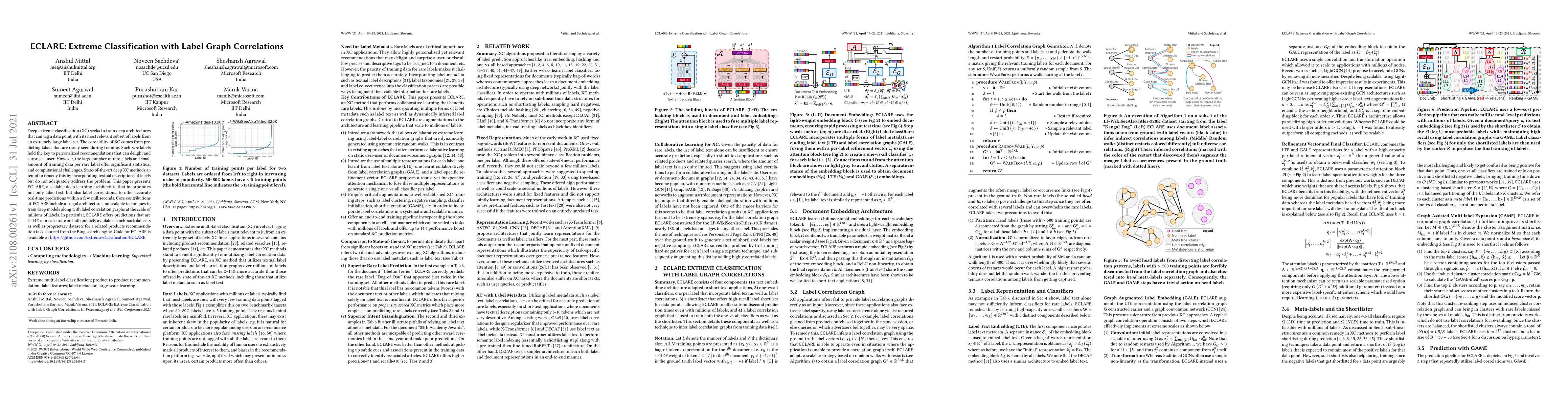 ECLARE presents a scalable deep learning architecture for extreme classification, incorporating label text and correlations to improve rare label prediction accuracy. It achieves 2 to 14% better performance on benchmark and proprietary datasets, addressing the challenges of large label sets and limited training data.