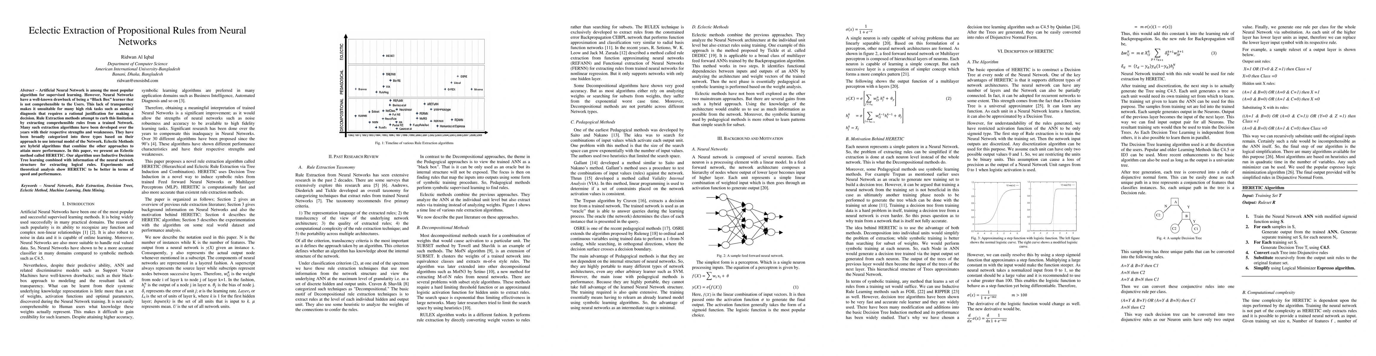 This paper introduces HERETIC, an Eclectic extraction method for deriving comprehensible propositional rules from trained Neural Networks. Combining Inductive Decision Tree learning with neural network structure information, HERETIC aims to improve transparency and performance, demonstrating superior speed and effectiveness in experiments.