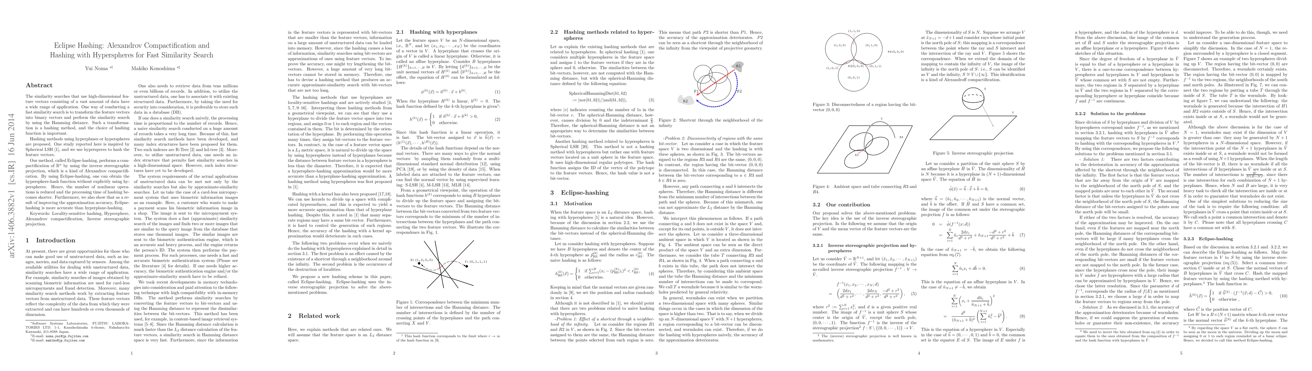 The similarity searches that use high-dimensional feature vectors consisting of a vast amount of data have a wide range of application. One way of conducting a fast similarity search is to transform the feature vectors into binary vectors and perform the similarity search by using the Hamming distance. Such a transformation is a hashing method, and the choice of hashing function is important. Hashing methods using hyperplanes or hyperspheres are proposed. One study reported here is inspired by Spherical LSH, and we use hypersperes to hash the feature vectors. Our method, called Eclipse-hashing, performs a compactification of R^n by using the inverse stereographic projection, which is a kind of Alexandrov compactification. By using Eclipse-hashing, one can obtain the hypersphere-hash function without explicitly using hyperspheres. Hence, the number of nonlinear operations is reduced and the processing time of hashing becomes shorter. Furthermore, we also show that as a result of improving the approximation accuracy, Eclipse-hashing is more accurate than hyperplane-hashing.