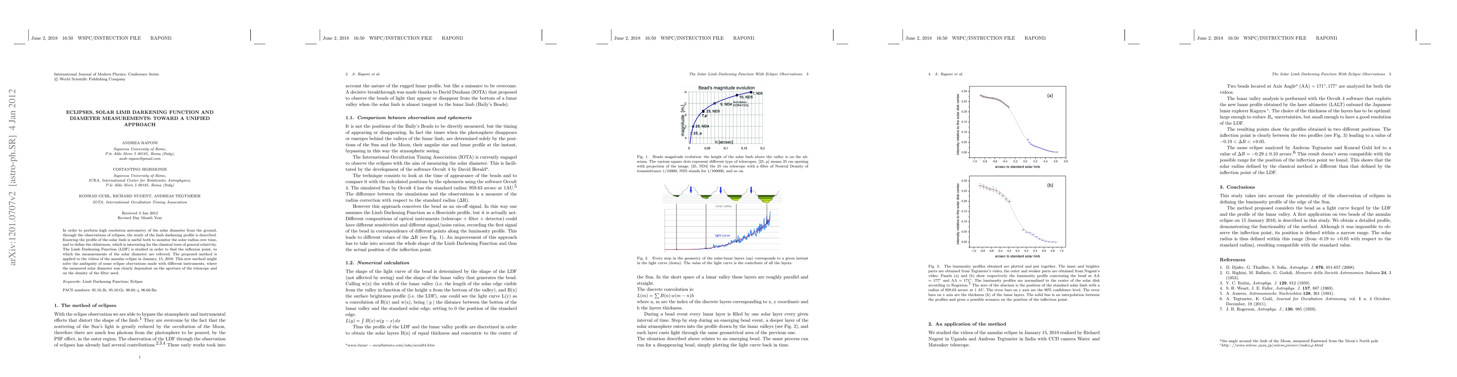 This paper explores a new method for high-resolution astrometry of the solar diameter using eclipse observations, focusing on the limb darkening profile to define the solar radius and oblateness. The study proposes a unified approach to resolve ambiguities in previous measurements affected by telescope aperture and filter density.