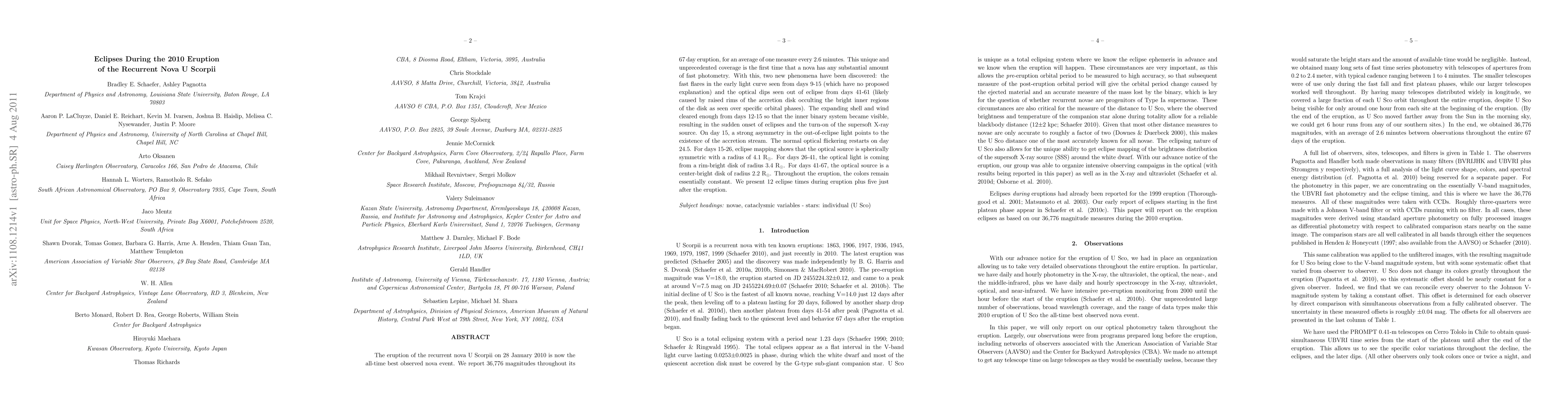 The eruption of the recurrent nova U Scorpii on 28 January 2010 is now the all-time best observed nova event. We report 36,776 magnitudes throughout its 67 day eruption, for an average of one measure every 2.6 minutes. This unique and unprecedented coverage is the first time that a nova has any substantial amount of fast photometry. With this, two new phenomena have been discovered: the fast flares in the early light curve seen from days 9-15 (which have no proposed explanation) and the optical dips seen out of eclipse from days 41-61 (likely caused by raised rims of the accretion disk occulting the bright inner regions of the disk as seen over specific orbital phases). The expanding shell and wind cleared enough from days 12-15 so that the inner binary system became visible, resulting in the sudden onset of eclipses and the turn-on of the supersoft X-ray source. On day 15, a strong asymmetry in the out-of-eclipse light points to the existence of the accretion stream. The normal optical flickering restarts on day 24.5. For days 15-26, eclipse mapping shows that the optical source is spherically symmetric with a radius of 4.1 R_sun. For days 26-41, the optical light is coming from a rim-bright disk of radius 3.4 R_sun. For days 41-67, the optical source is a center-bright disk of radius 2.2 R_sun. Throughout the eruption, the colors remain essentially constant. We present 12 eclipse times during eruption plus five just after the eruption.