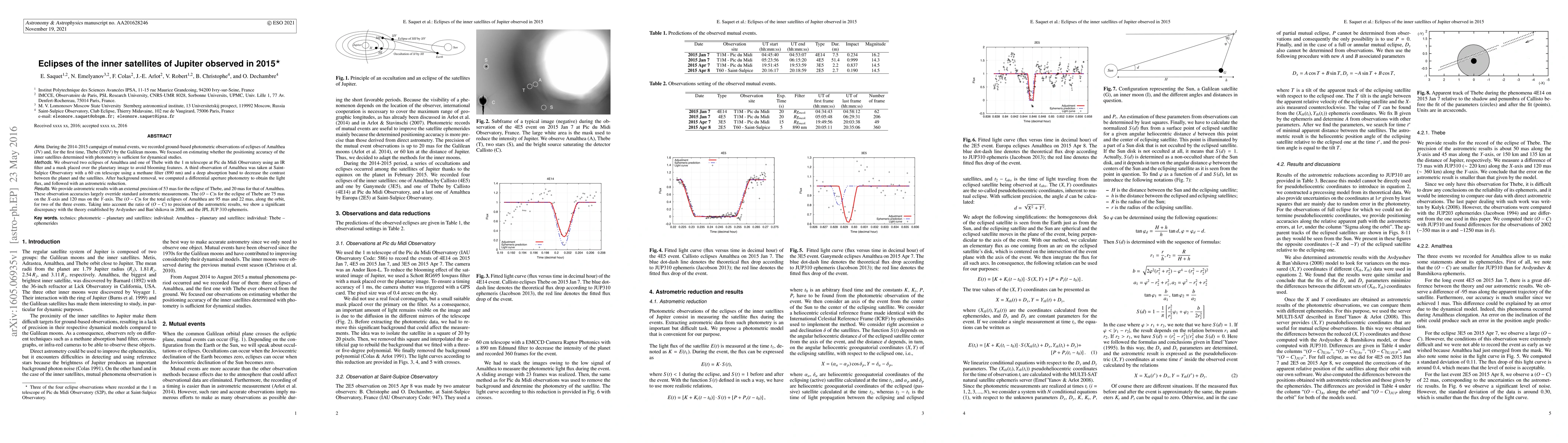 During the 2014-2015 campaign of mutual events, we recorded ground-based photometric observations of eclipses of Amalthea (JV) and, for the first time, Thebe (JXIV) by the Galilean moons. We focused on estimating whether the positioning accuracy of the inner satellites determined with photometry is sufficient for dynamical studies. We observed two eclipses of Amalthea and one of Thebe with the 1 m telescope at Pic du Midi Observatory using an IR filter and a mask placed over the planetary image to avoid blooming features. A third observation of Amalthea was taken at Saint-Sulpice Observatory with a 60 cm telescope using a methane filter (890 nm) and a deep absorption band to decrease the contrast between the planet and the satellites. After background removal, we computed a differential aperture photometry to obtain the light flux, and followed with an astrometric reduction. We provide astrometric results with an external precision of 53 mas for the eclipse of Thebe, and 20 mas for that of Amalthea. These observation accuracies largely override standard astrometric measurements. The (O-C)s for the eclipse of Thebe are 75 mas on the X-axis and 120 mas on the Y-axis. The (O-C)s for the total eclipses of Amalthea are 95 mas and 22 mas, along the orbit, for two of the three events. Taking into account the ratio of (O-C) to precision of the astrometric results, we show a significant discrepancy with the theory established by Avdyushev and Ban'shikova in 2008, and the JPL JUP 310 ephemeris.