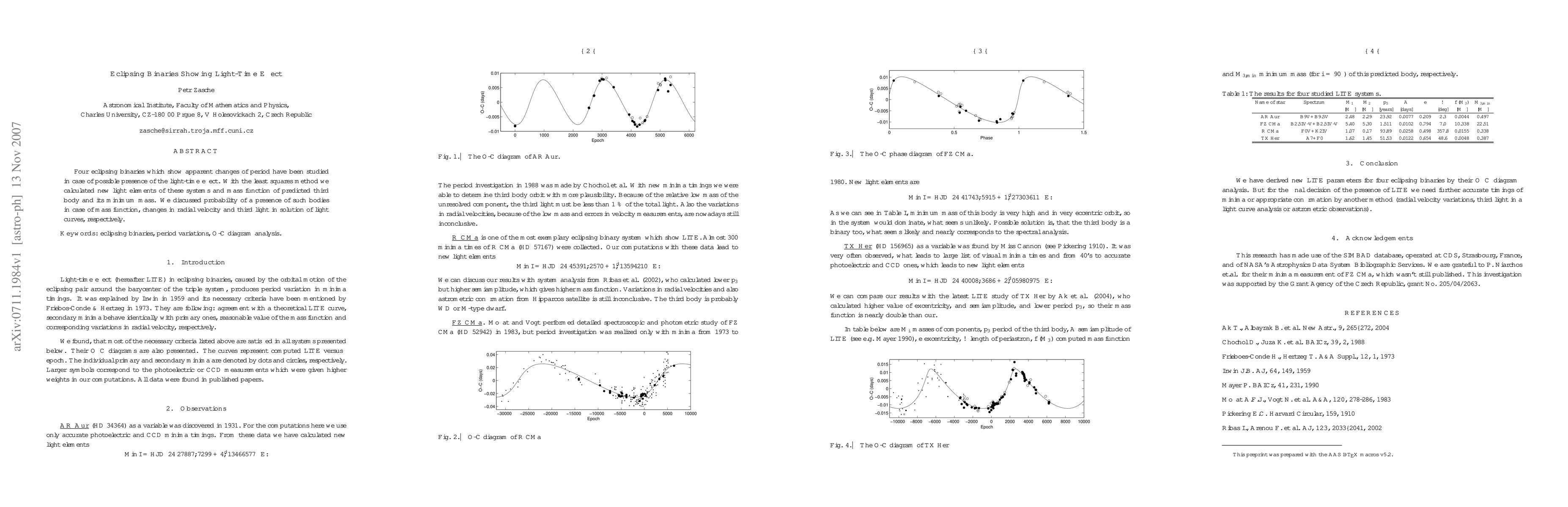 Four eclipsing binaries, which show apparent changes of period, have been studied with respect to a possible presence of the light time effect. With a least squares method we calculated new light elements of these systems, the mass function of the predicted third body, and its minimum mass. We discuss the probability of the presence of such bodies in terms of mass function, changes in radial velocity and third light in solution of light curves.