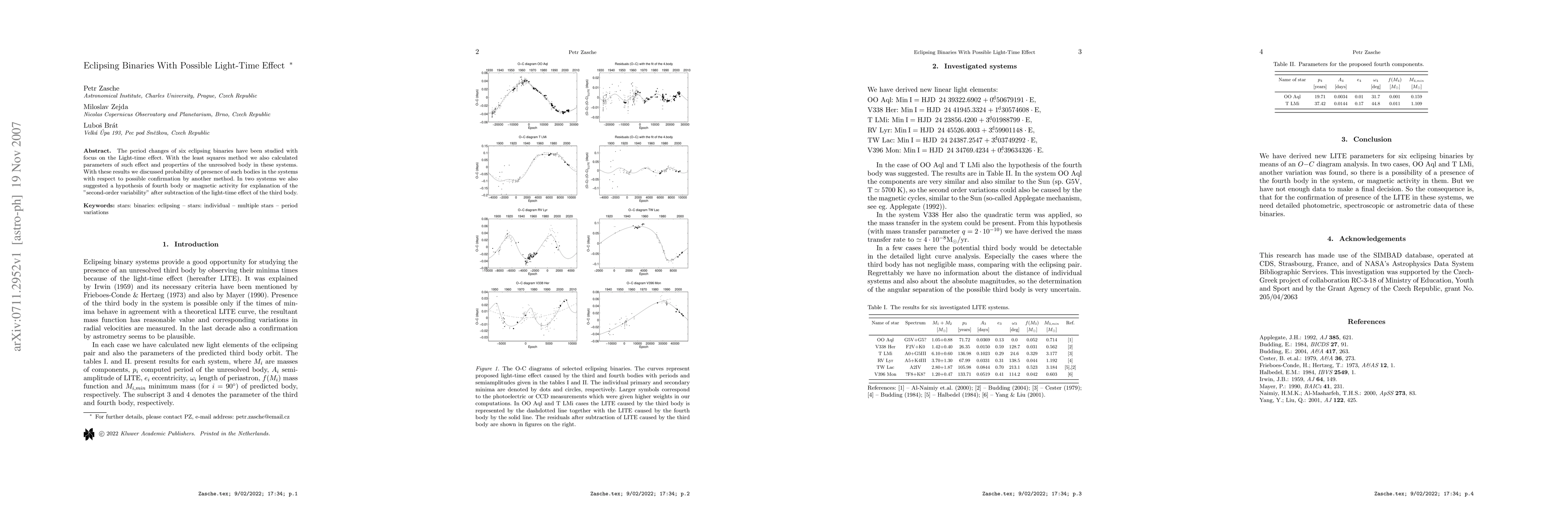 This paper investigates period changes in six eclipsing binaries, analyzing the light-time effect and calculating related parameters using the least squares method. It discusses the likelihood of unresolved third bodies and suggests hypotheses for "second-order variability" in two systems, potentially due to a fourth body or magnetic activity.