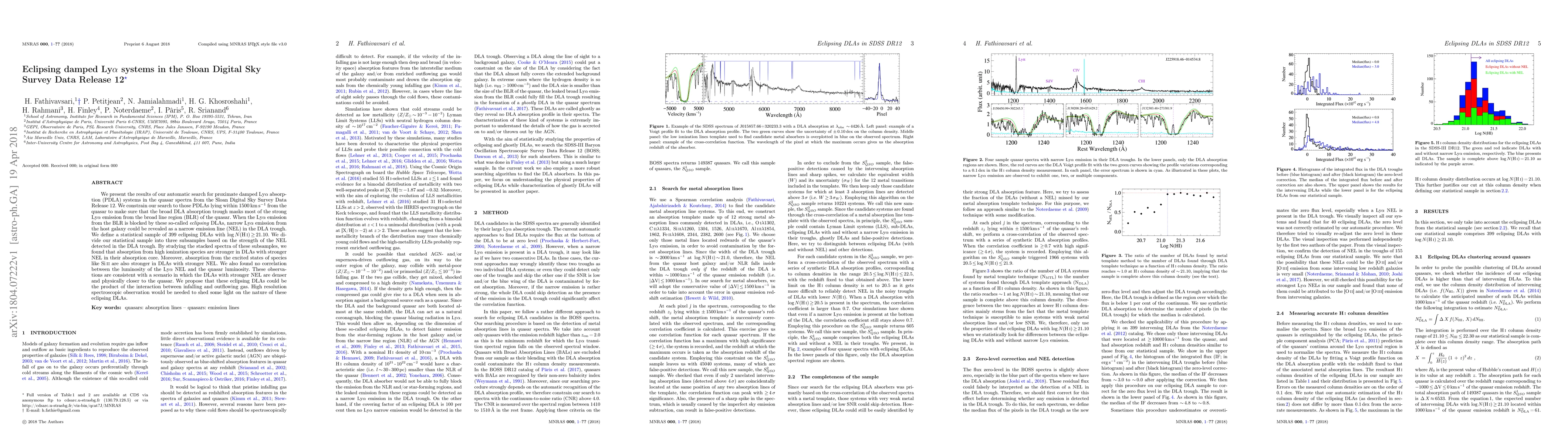 This paper reports an automatic search for eclipsing damped Ly$\alpha$ absorption systems in quasar spectra from SDSS DR12, identifying 399 such systems. The study reveals that DLAs with stronger narrow Ly$\alpha$ emission lines show stronger absorption from high ionization species, suggesting a denser and closer interaction between infalling and outflowing gas.