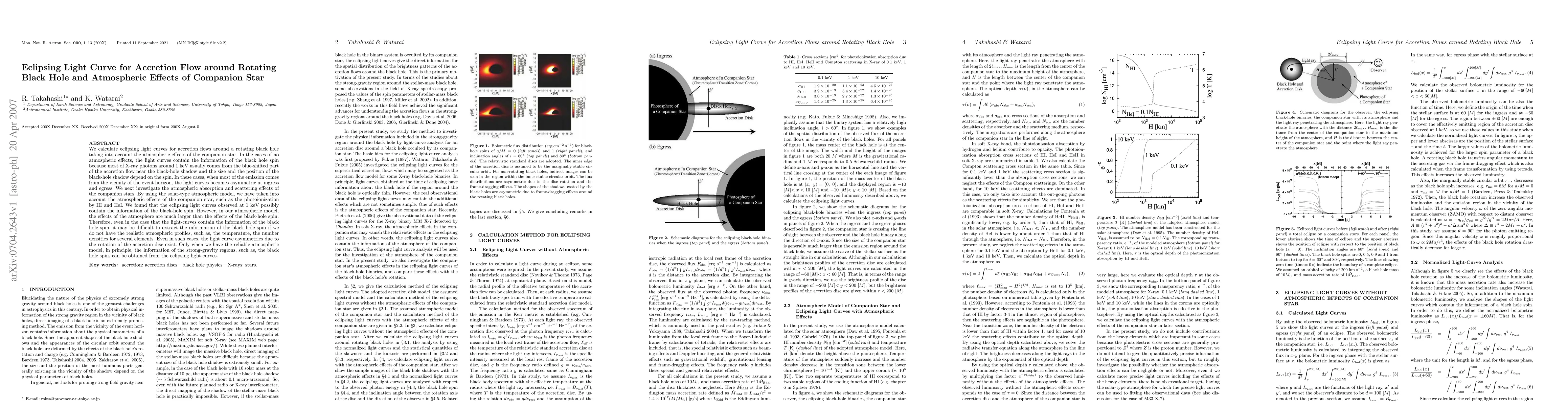 We calculate eclipsing light curves for accretion flows around a rotating black hole taking into account the atmospheric effects of the companion star. In the cases of no atmospheric effects, the light curves contain the information of the black hole spin because most of the X-ray photons around 1 keV usually come from the blueshifted part of the accretion flow near the black hole shadow, and the size and the position of the black hole shadow depend on the spin. In these cases, when most of the emission comes from the vicinity of the event horizon, the light curves become asymmetric at ingress and egress. We next investigate the atmospheric absorption and scattering effects of the companion stars. By using the solar-type atmospheric model, we have taken into account the atmospheric effects of the companion star, such as the photoionization by HI and HeI. We found that the eclipsing light curves observed at 1 keV possibly contain the information of the black hole spin. However, in our atmospheric model, the effects of the atmosphere are much larger than the effects of the black hole spin. Therefore, even in the case that the light curves contain the information of the black hole spin, it may be difficult to extract the information of the black hole spin if we do not have the realistic atmospheric profiles, such as the temperature, and the number densities for several elements. Even in such cases, the light-curve asymmetries due to the rotation of the accretion disc exist. Only when we have the reliable atmospheric model, in principle, the information of the strong-gravity regions, such as the black hole spin, can be obtained from the eclipsing light curves.