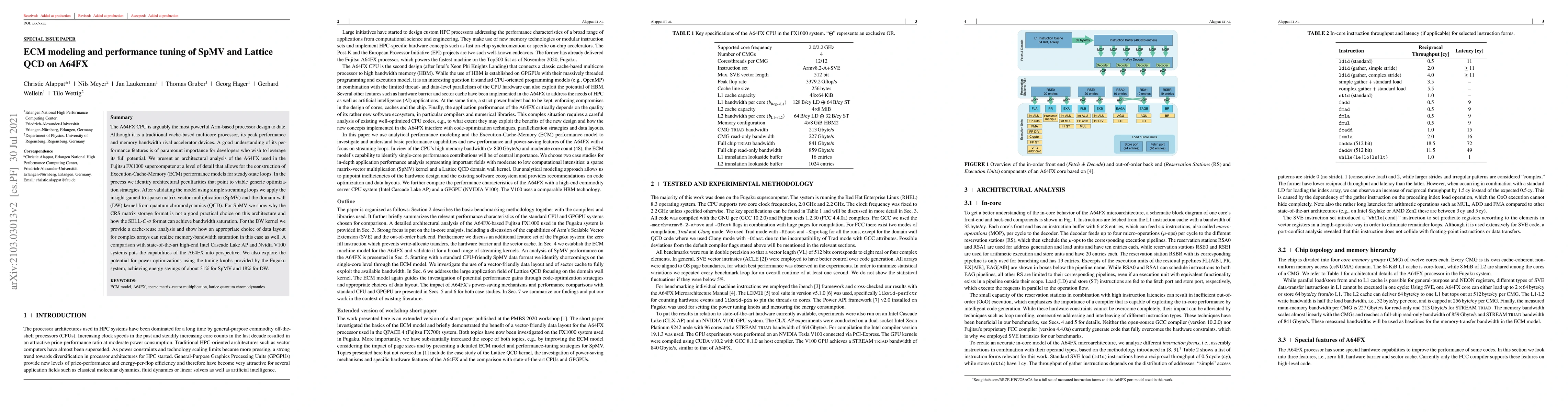 This paper presents an in-depth architectural analysis of the A64FX CPU, constructing ECM performance models to optimize SpMV and Lattice QCD computations. It identifies effective data formats and optimization strategies, achieving significant performance and energy improvements compared to Intel and Nvidia systems.