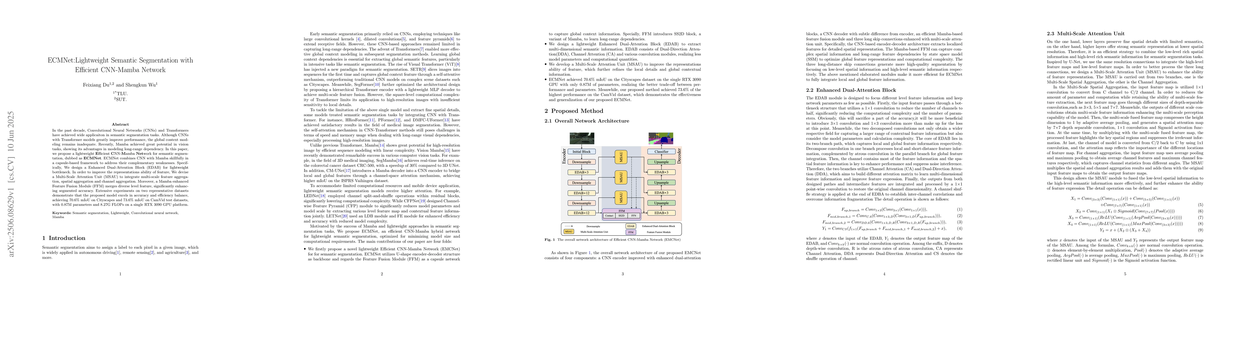 This paper proposes ECMNet, a lightweight semantic segmentation model combining CNNs with Mamba for efficient global context modeling. It achieves 70.6% mIoU on Cityscapes and 73.6% mIoU on CamVid datasets.