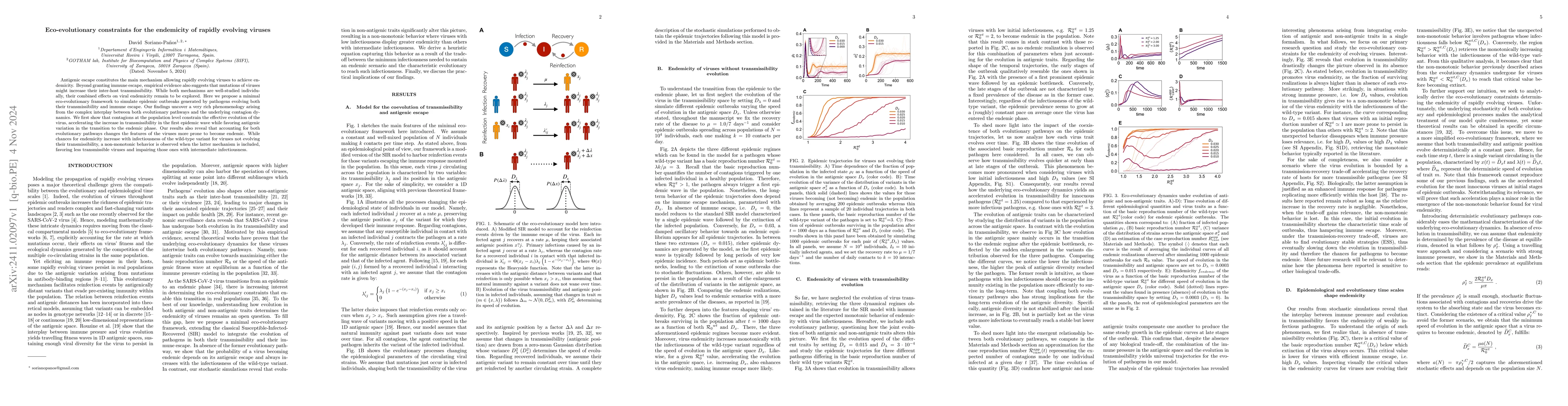 Antigenic escape constitutes the main mechanism allowing rapidly evolving viruses to achieve endemicity. Beyond granting immune escape, empirical evidence also suggests that mutations of viruses might increase their inter-host transmissibility. While both mechanisms are well-studied individually, their combined effects on viral endemicity remain to be explored. Here we propose a minimal eco-evolutionary framework to simulate epidemic outbreaks generated by pathogens evolving both their transmissibility and immune escape. Our findings uncover a very rich phenomenology arising from the complex interplay between both evolutionary pathways and the underlying contagion dynamics. We first show that contagions at the population level constrain the effective evolution of the virus, accelerating the increase in transmissibility in the first epidemic wave while favoring antigenic variation in the transition to the endemic phase. Our results also reveal that accounting for both evolutionary pathways changes the features of the viruses more prone to become endemic. While chances for endemicity increase with infectiousness of the wild-type variant for viruses not evolving their transmissibility, a non-monotonic behavior is observed when the latter mechanism is included, favoring less transmissible viruses and impairing those ones with intermediate infectiousness.