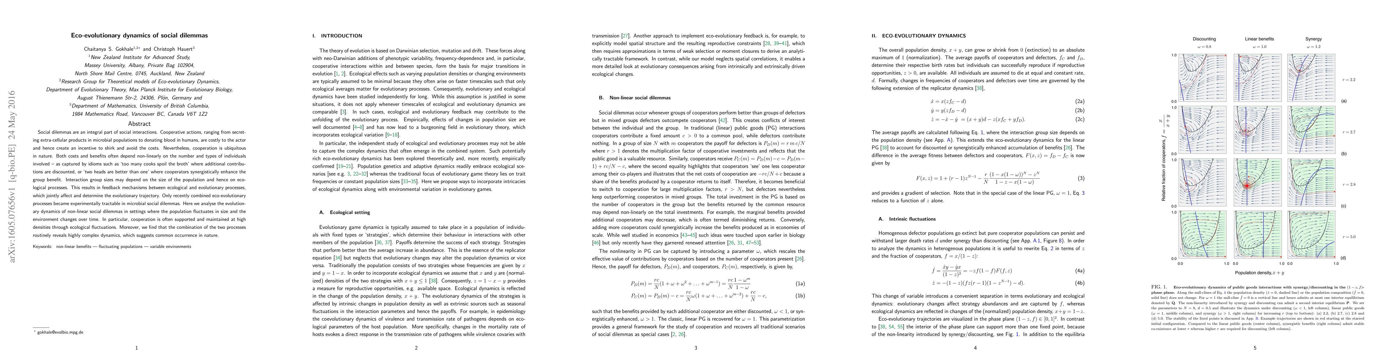This paper explores the interplay between ecological and evolutionary processes in social dilemmas, demonstrating how fluctuating population sizes and environmental changes can sustain cooperation through complex feedback mechanisms. The study highlights the intricate dynamics that arise from combining eco-evolutionary dynamics, suggesting their common presence in natural systems.