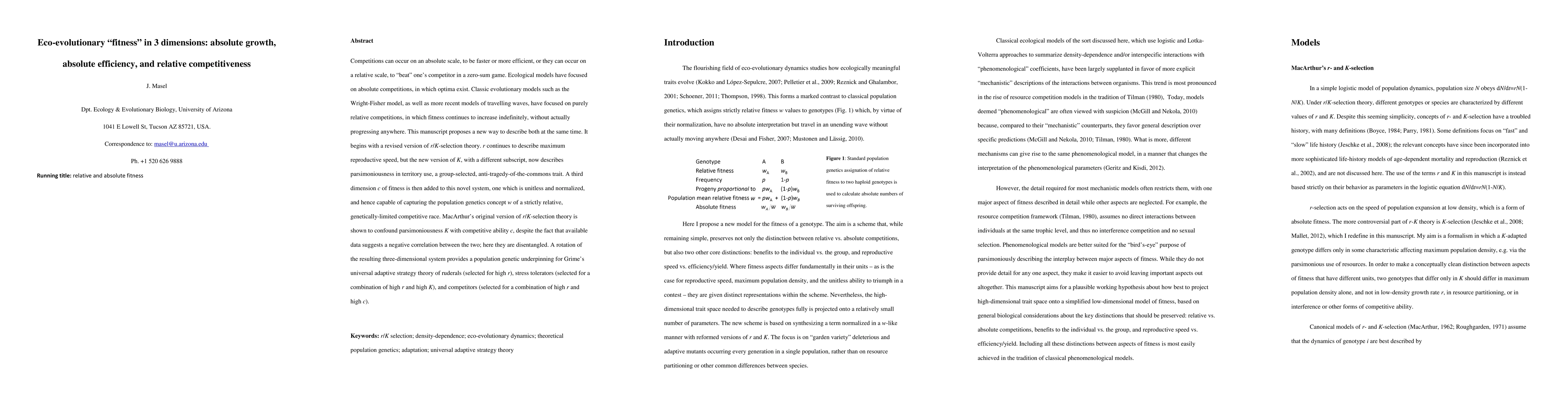 This paper proposes a three-dimensional framework for eco-evolutionary fitness, incorporating absolute growth, efficiency, and relative competitiveness, to disentangle previously conflated traits in r/K-selection theory and provide a clearer understanding of ecological and evolutionary dynamics. The new model separates parsimoniousness in territory use from competitive ability, aligning with observed data and supporting Grime's adaptive strategy theory.