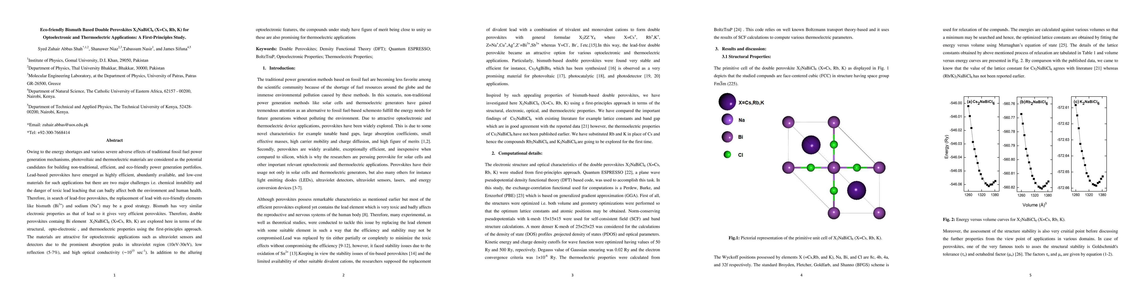 Owing to the energy shortages and various severe adverse effects of traditional fossil fuel power generation mechanisms, photovoltaic and thermoelectric materials are considered as the potential candidates for building non-traditional, efficient, and eco-friendly power generation portfolios. Lead-based perovskites have emerged as highly efficient, abundantly available, and low-cost materials for such applications but there are two major challenges i.e. chemical instability and the danger of toxic lead leaching that can badly affect both the environment and human health. Therefore, in search of lead-free perovskites, the replacement of lead with eco-friendly elements like bismuth and sodium may be a good strategy. Bismuth has very similar electronic properties as that of lead so it gives very efficient perovskites. Therefore, double perovskites containg Bi element X$_2$NaBiCl$_6$ (X=Cs, Rb, K) are explored here in terms of the structural, opto-electronic , and thermoelectric properties using the first-principles approach. The materials are attractive for optoelectronic applications such as ultraviolet sensors and detectors due to the prominent absorption peaks in ultraviolet region (10eV-30eV), low reflection (5-7%), and high optical conductivity. In addition to the alluring optoelectronic features, the compounds under study have figure of merit being close to unity so these are also promising for thermoelectric applications.