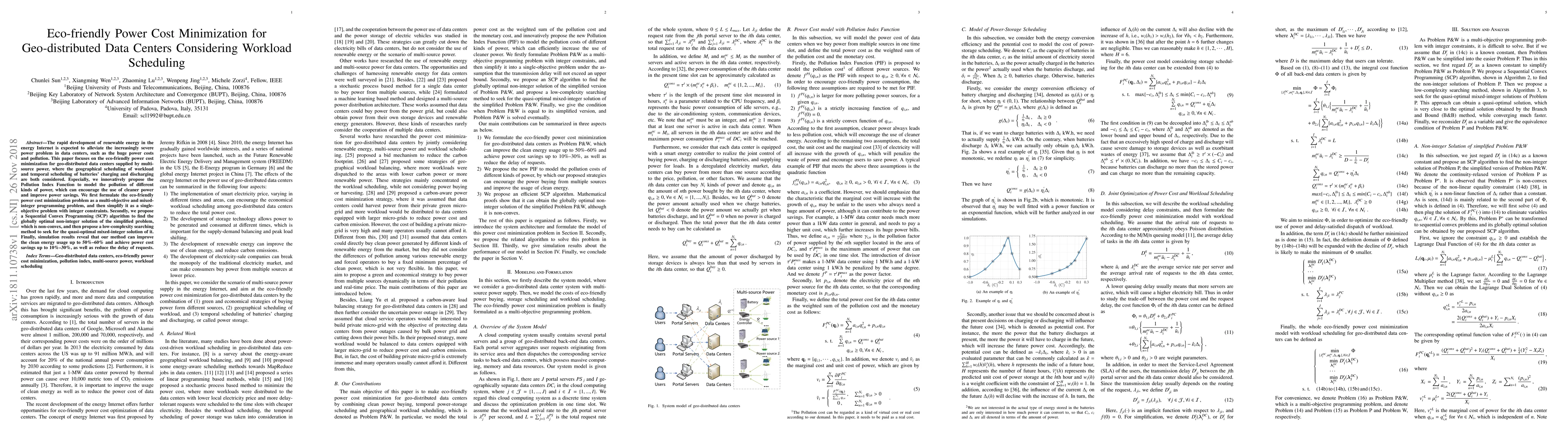 This paper proposes an eco-friendly power cost minimization strategy for geo-distributed data centers using multi-source power, focusing on workload scheduling and battery management. It introduces a Pollution Index Function to encourage cleaner power use and presents a Sequential Convex Programming algorithm to achieve quasi-optimal mixed-integer solutions, resulting in up to 60% cleaner energy usage and 30% power cost savings.