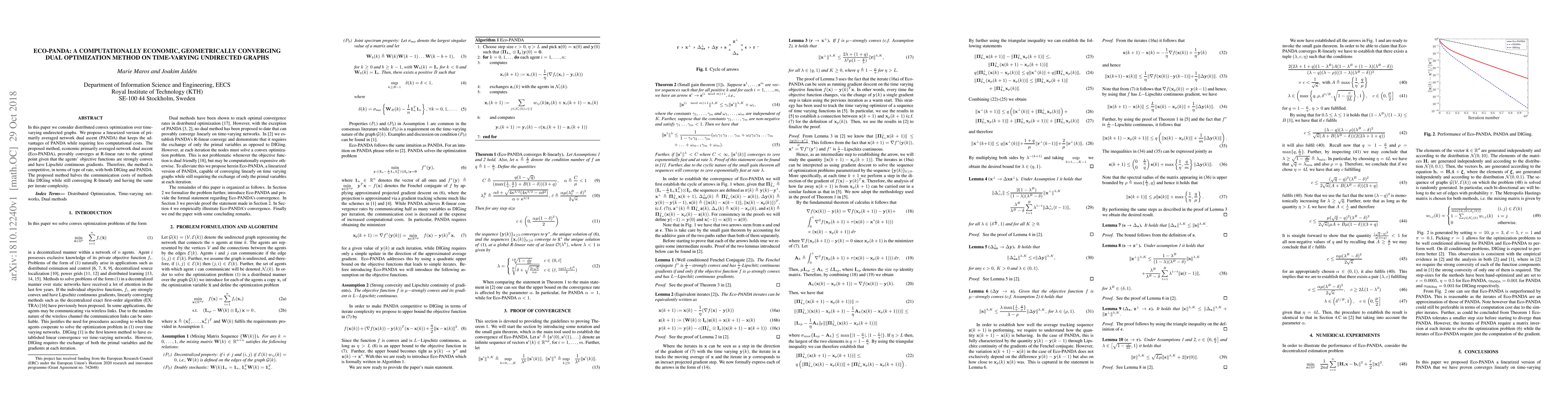 Summary: Eco-PANDA is a computationally efficient distributed convex optimization method for time-varying undirected graphs that converges geometrically. It halves communication costs compared to DIGing while maintaining R-linear convergence and similar per-iteration complexity.