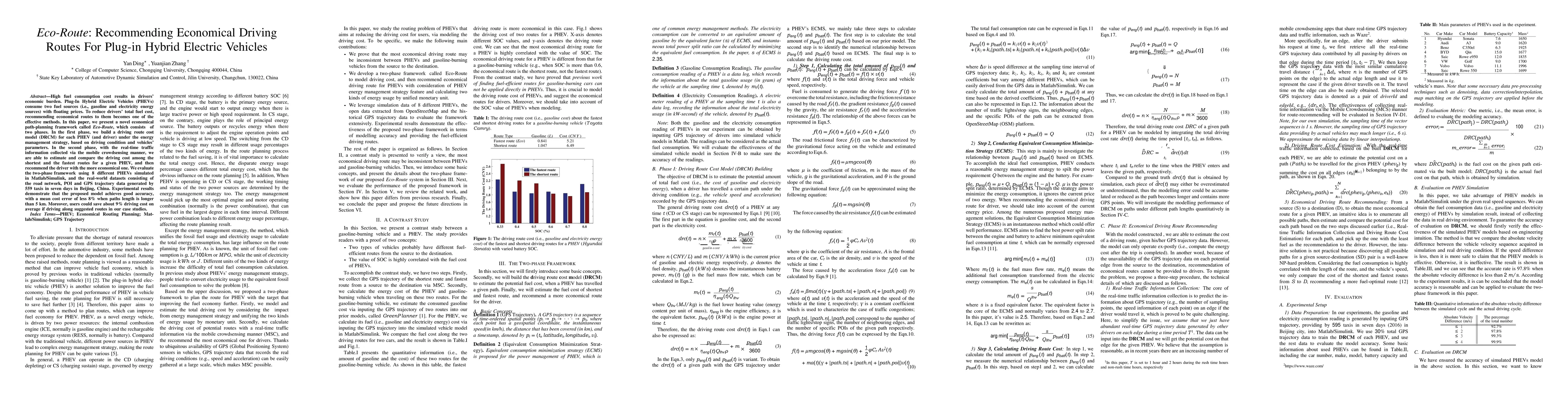 The Eco-Route framework recommends economical driving routes for Plug-In Hybrid Electric Vehicles by modeling driving costs based on energy management strategies and real-time traffic data. Experimental results show a mean cost error of less than 8% for routes longer than 5 km and an average 9% savings in driving costs.