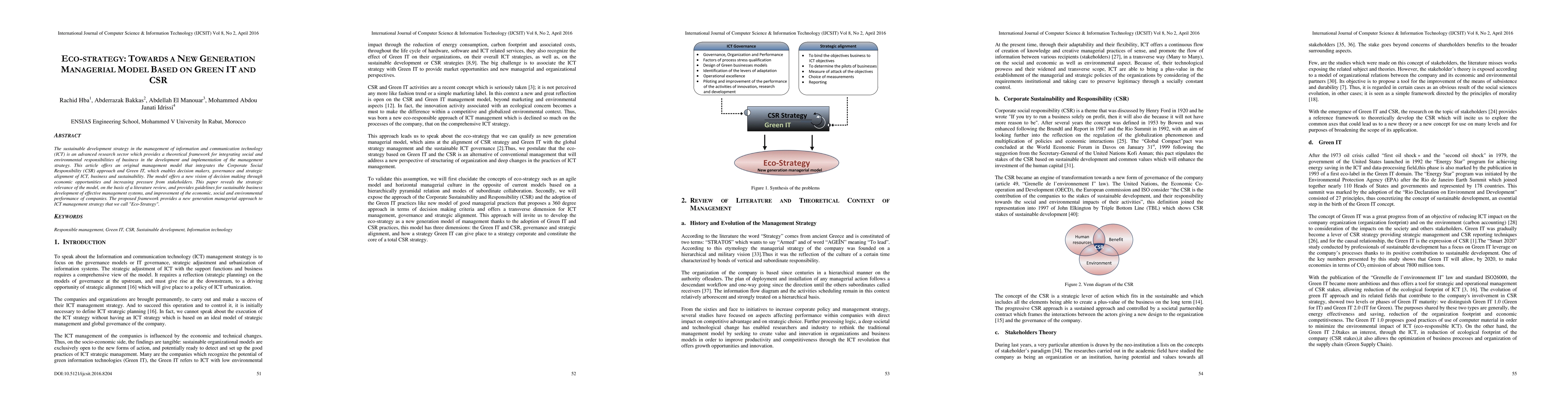 This paper proposes an "Eco-Strategy" managerial model integrating Green IT and Corporate Social Responsibility (CSR) to align ICT management with sustainability goals. It emphasizes strategic relevance and offers guidelines for enhancing economic, social, and environmental performance through sustainable business development.