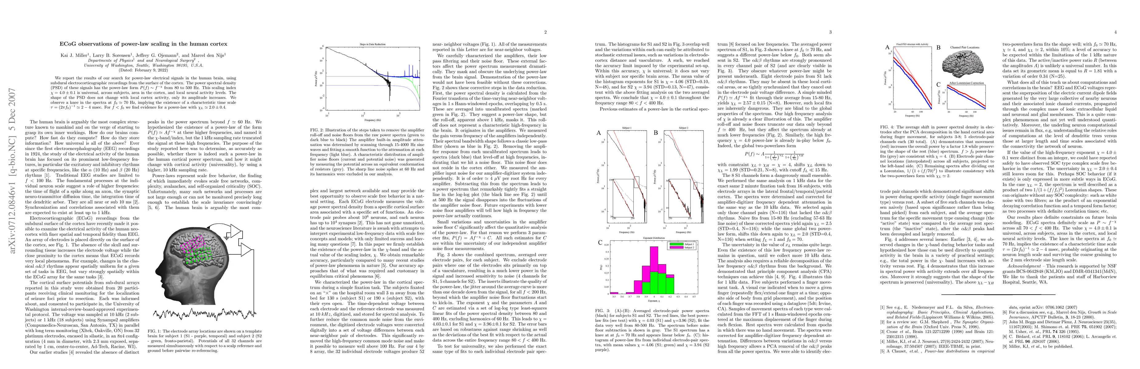 Researchers found power-law scaling in human brain signals using electrocorticographic recordings, with a universal scaling index across subjects and areas of the cortex.