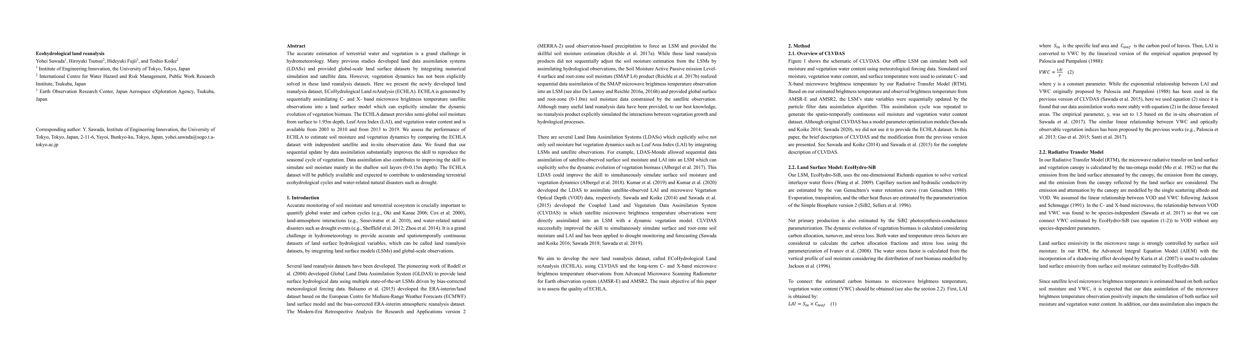 The paper introduces the ECoHydrological Land reAnalysis (ECHLA) dataset, which assimilates satellite observations into a land surface model to explicitly simulate vegetation dynamics. The dataset improves estimates of soil moisture and vegetation parameters, and is expected to enhance understanding of terrestrial ecohydrological cycles and water-related natural disasters.