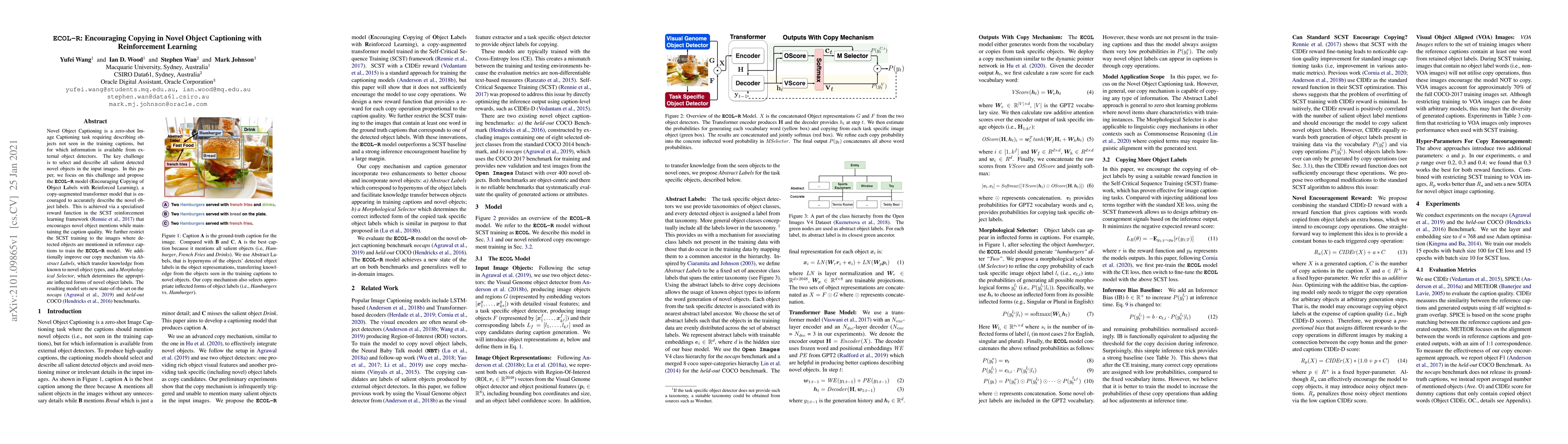 The ECOL-R model employs reinforcement learning to improve zero-shot image captioning for novel objects, using a specialized reward function to encourage accurate descriptions while maintaining caption quality. It achieves state-of-the-art performance on nocaps and COCO benchmarks.