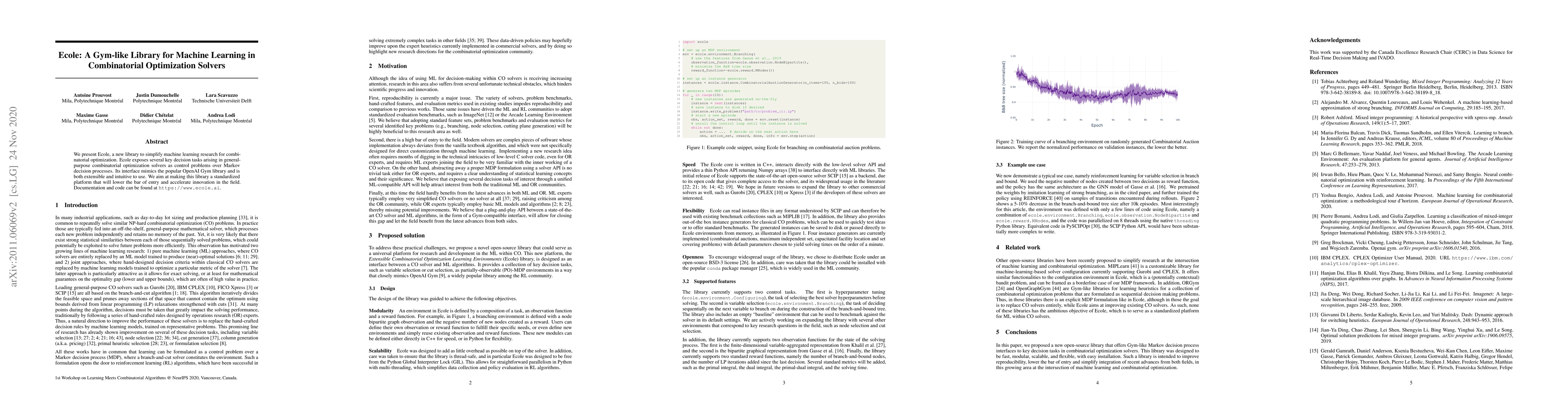 Ecole is a library designed to simplify machine learning research in combinatorial optimization by framing decision tasks as Markov decision processes, mimicking the intuitive interface of the popular Gym library. It aims to become a standardized platform to lower entry barriers and accelerate innovation in the field.