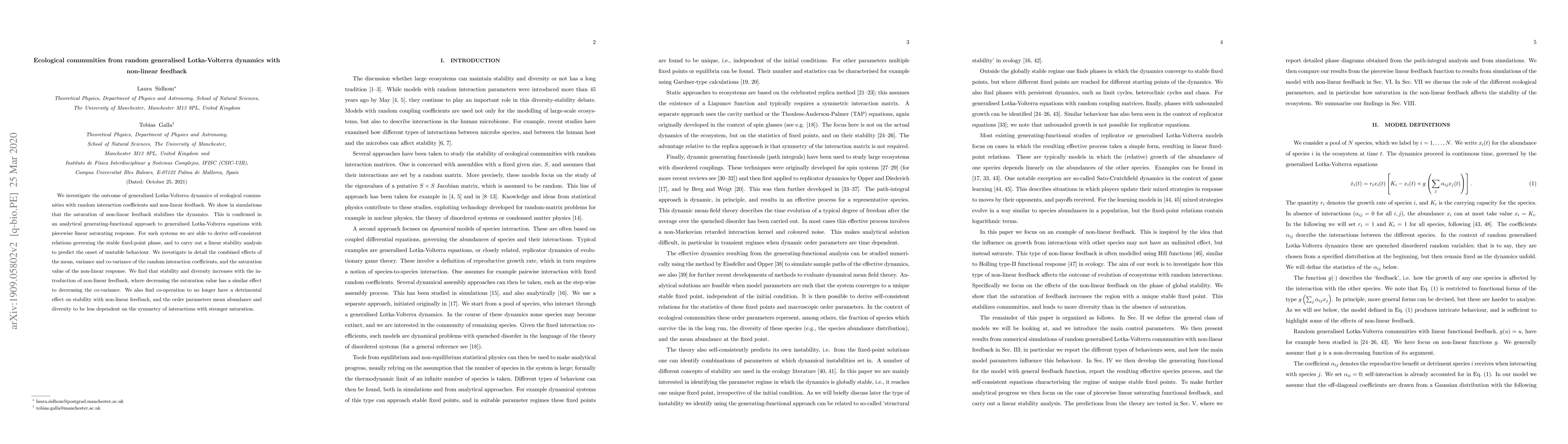 This paper explores the dynamics of ecological communities governed by generalised Lotka-Volterra equations with random interaction coefficients and non-linear feedback. The study finds that non-linear feedback saturation enhances stability and diversity, with stability increasing as the saturation value decreases, similar to reducing interaction variance.