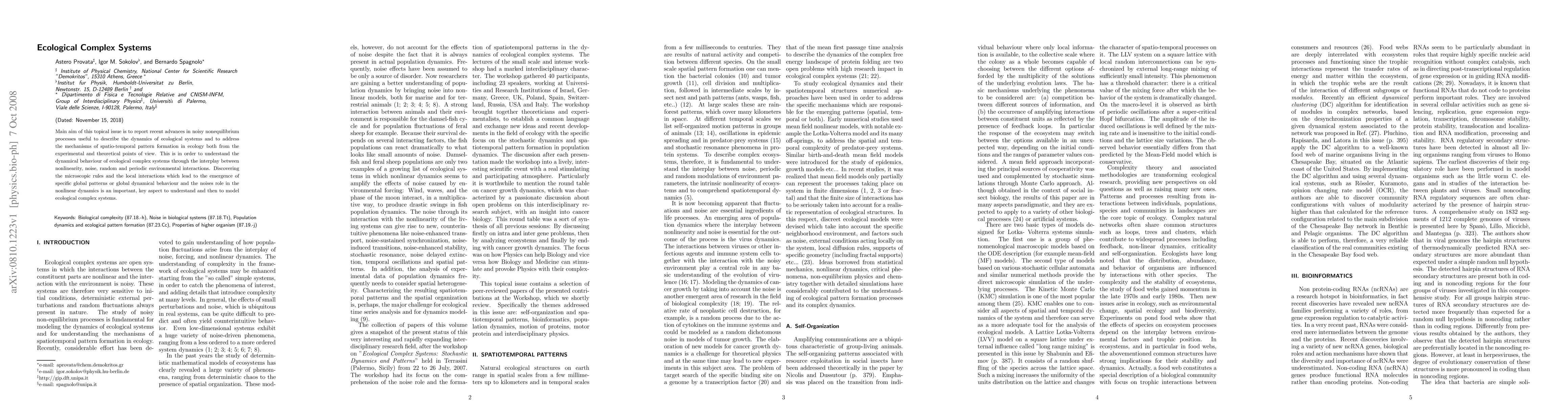 Main aim of this topical issue is to report recent advances in noisy nonequilibrium processes useful to describe the dynamics of ecological systems and to address the mechanisms of spatio-temporal pattern formation in ecology both from the experimental and theoretical points of view. This is in order to understand the dynamical behaviour of ecological complex systems through the interplay between nonlinearity, noise, random and periodic environmental interactions. Discovering the microscopic rules and the local interactions which lead to the emergence of specific global patterns or global dynamical behaviour and the noises role in the nonlinear dynamics is an important, key aspect to understand and then to model ecological complex systems.