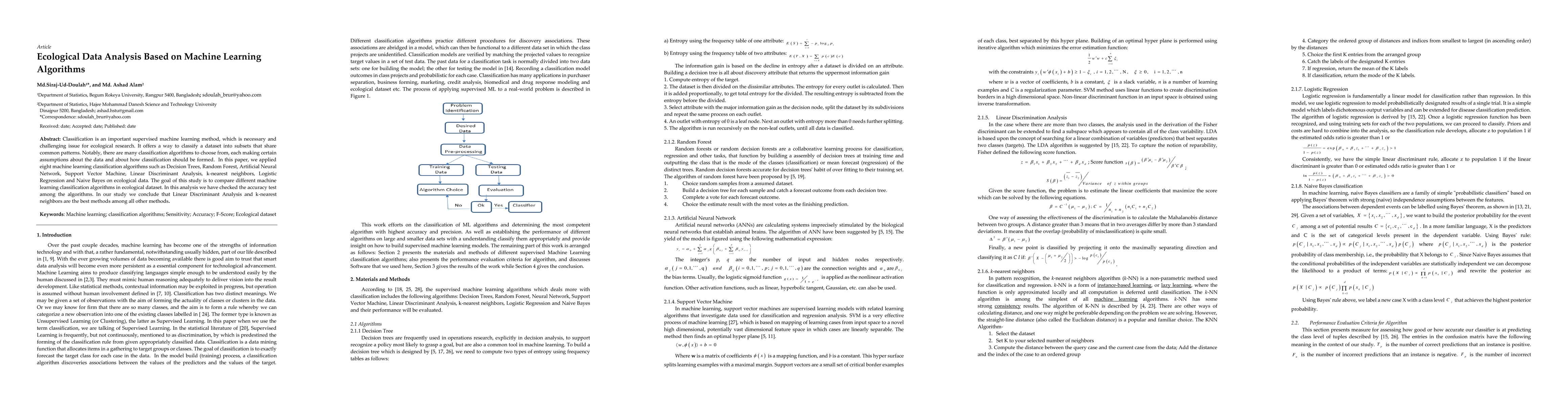 This paper evaluates eight machine learning classification algorithms on ecological data to determine the most effective method for classification. The results indicate that Linear Discriminant Analysis and k-nearest neighbors outperform the other algorithms in terms of accuracy.