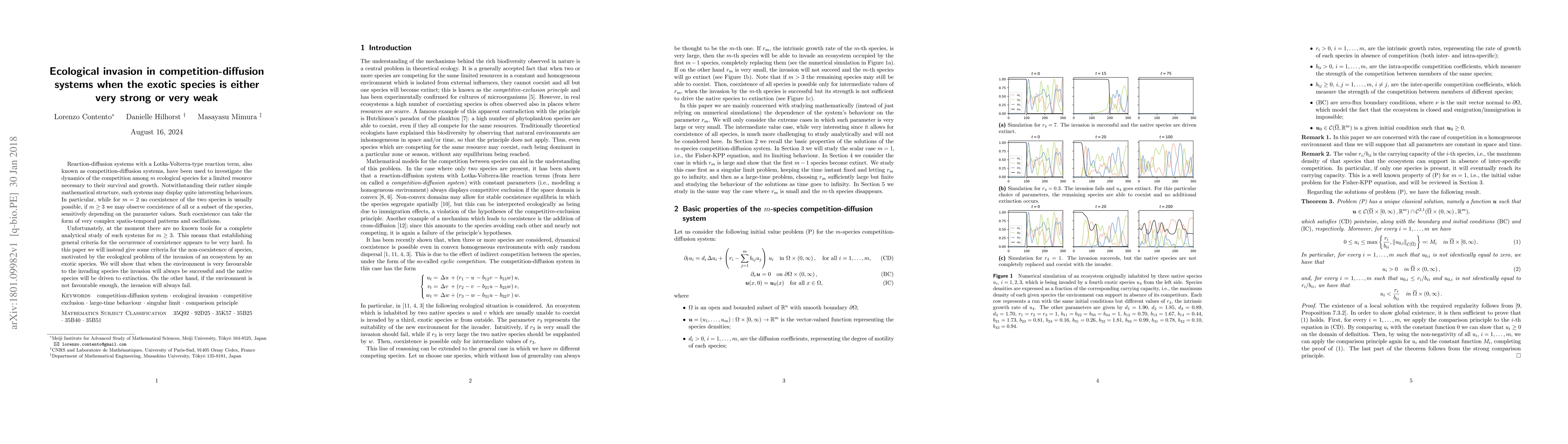 This paper investigates the dynamics of competition-diffusion systems, focusing on the invasion of an exotic species. It finds that when the environment is highly favorable to the invader, it will successfully drive native species to extinction, while unfavorable conditions will always result in the failure of the invasion.