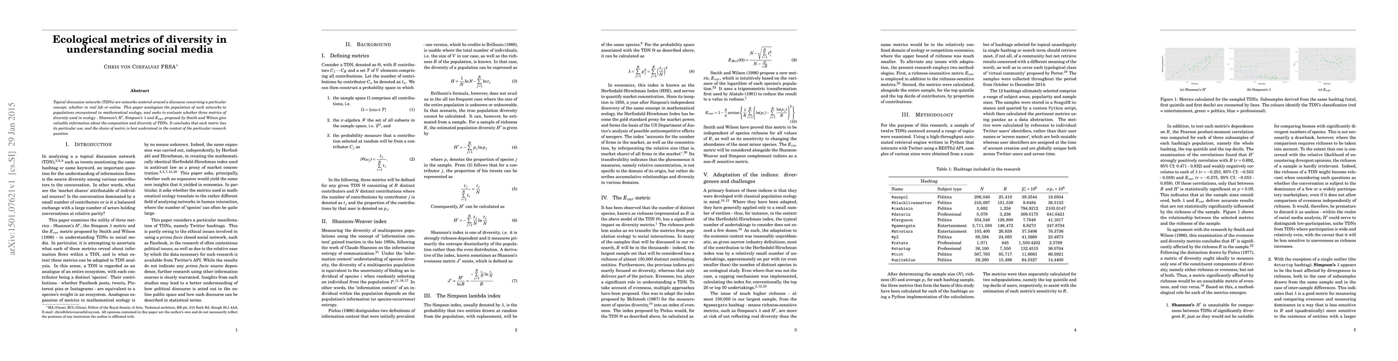 This paper applies ecological diversity metrics to analyze topical discussion networks on social media, finding each metric (Shannon's H', Simpson's lambda, and Smith & Wilson's E_var) offers unique insights depending on the research question.