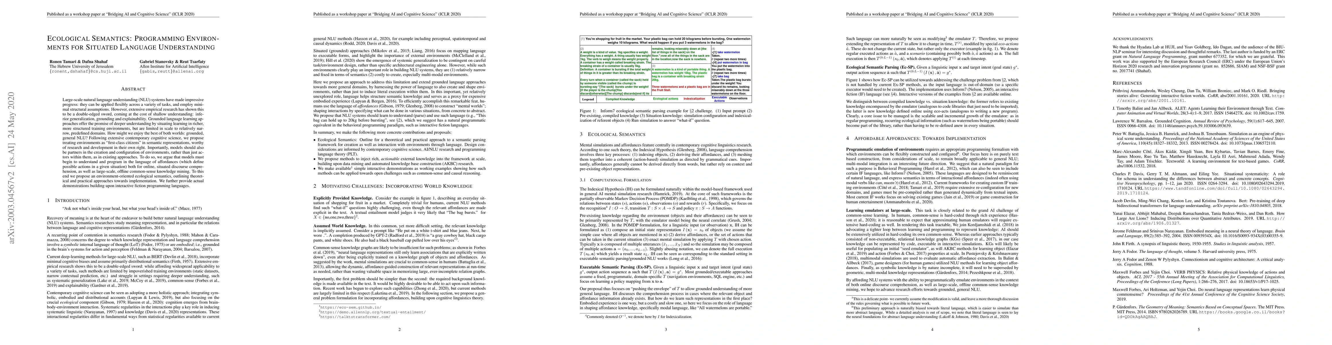 This paper proposes an ecological semantics framework for natural language understanding systems that situates learning in rich, structured environments to achieve deeper comprehension. It advocates for models to actively participate in creating and configuring these environments, leveraging affordances for both online discourse and large-scale knowledge mining.