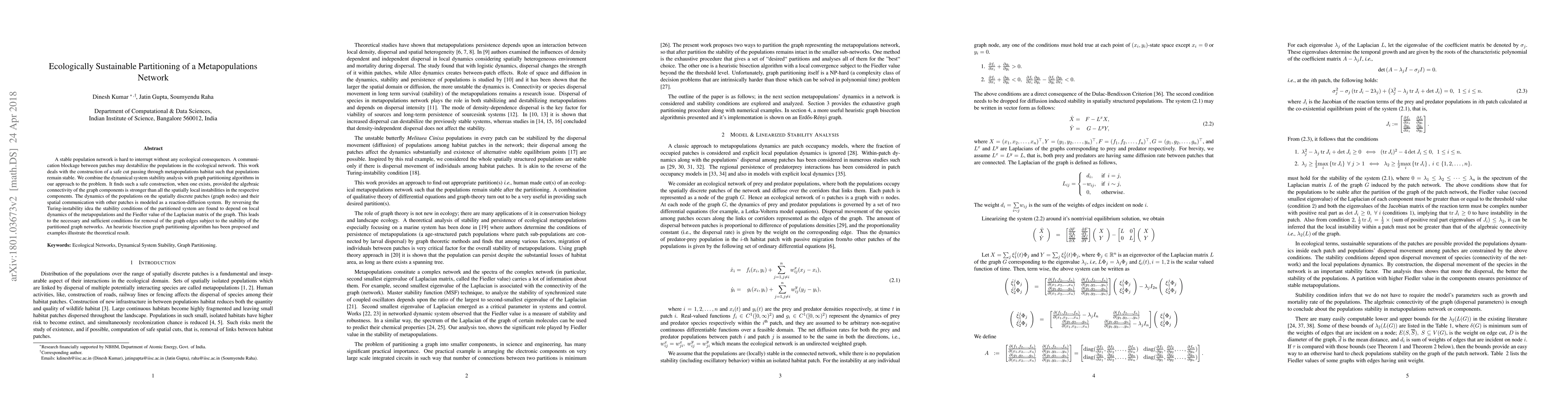 The research combines dynamical system stability analysis with graph partitioning algorithms to find a safe cut in a metapopulation network that maintains population stability, using a reaction-diffusion system to model population dynamics across spatially discrete patches.