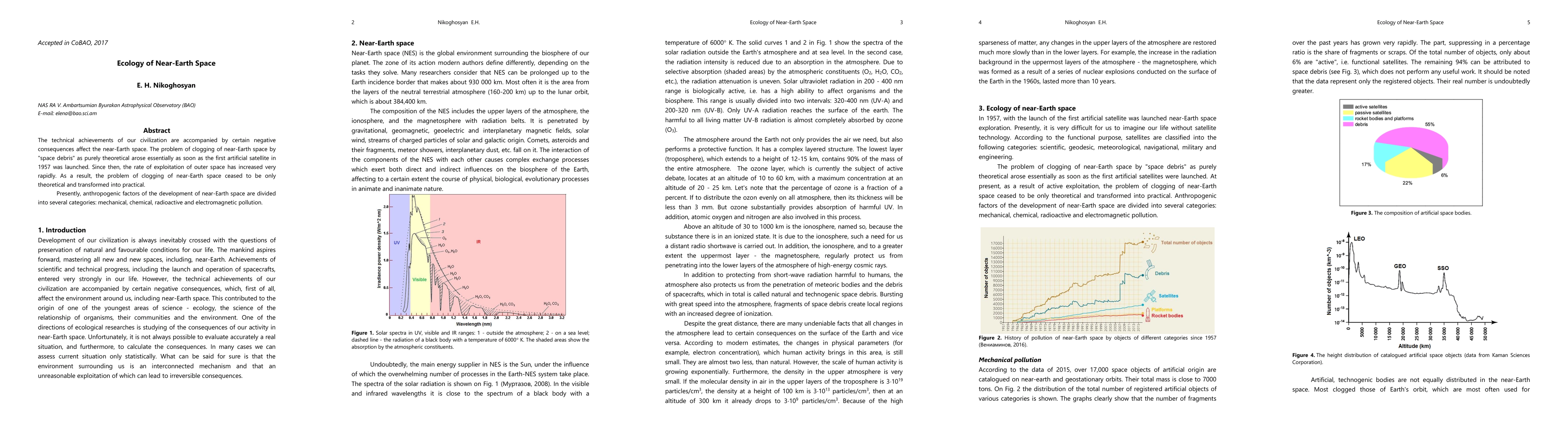 The technical achievements of our civilization are accompanied by certain negative consequences affect the near-Earth space. The problem of clogging of near-Earth space by "space debris" as purely theoretical arose essentially as soon as the first artificial satellite in 1957 was launched. Since then, the rate of exploitation of outer space has increased very rapidly. As a result, the problem of clogging of near-Earth space ceased to be only theoretical and transformed into practical. Presently, anthropogenic factors of the development of near-Earth space are divided into several categories: mechanical, chemical, radioactive and electromagnetic pollution.