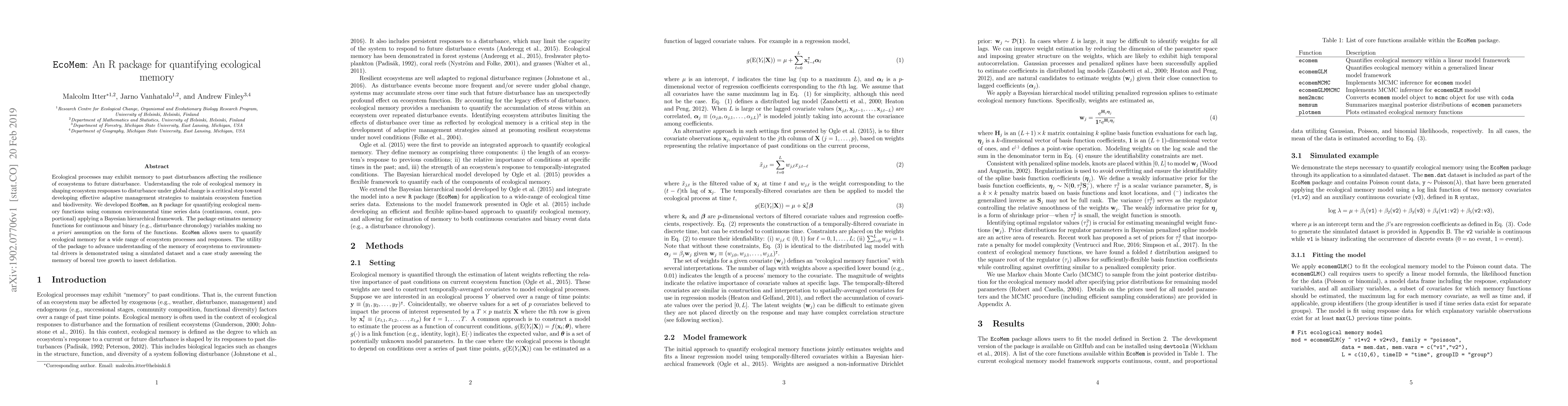 Ecological processes may exhibit memory to past disturbances affecting the resilience of ecosystems to future disturbance. Understanding the role of ecological memory in shaping ecosystem responses to disturbance under global change is a critical step toward developing effective adaptive management strategies to maintain ecosystem function and biodiversity. We developed EcoMem, an R package for quantifying ecological memory functions using common environmental time series data (continuous, count, proportional) applying a Bayesian hierarchical framework. The package estimates memory functions for continuous and binary (e.g., disturbance chronology) variables making no a priori assumption on the form of the functions. EcoMem allows users to quantify ecological memory for a wide range of ecosystem processes and responses. The utility of the package to advance understanding of the memory of ecosystems to environmental drivers is demonstrated using a simulated dataset and a case study assessing the memory of boreal tree growth to insect defoliation.