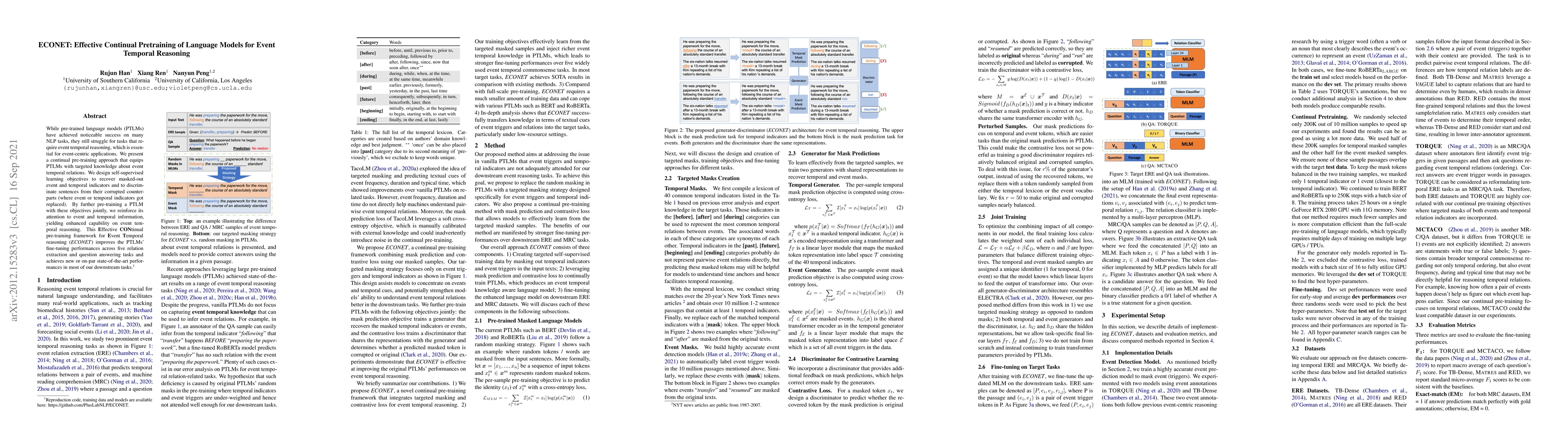 ECONET introduces a continual pre-training method to enhance pre-trained language models' ability for event temporal reasoning by incorporating self-supervised learning objectives focused on event and temporal indicators. This method improves model performance on relation extraction and question answering tasks.