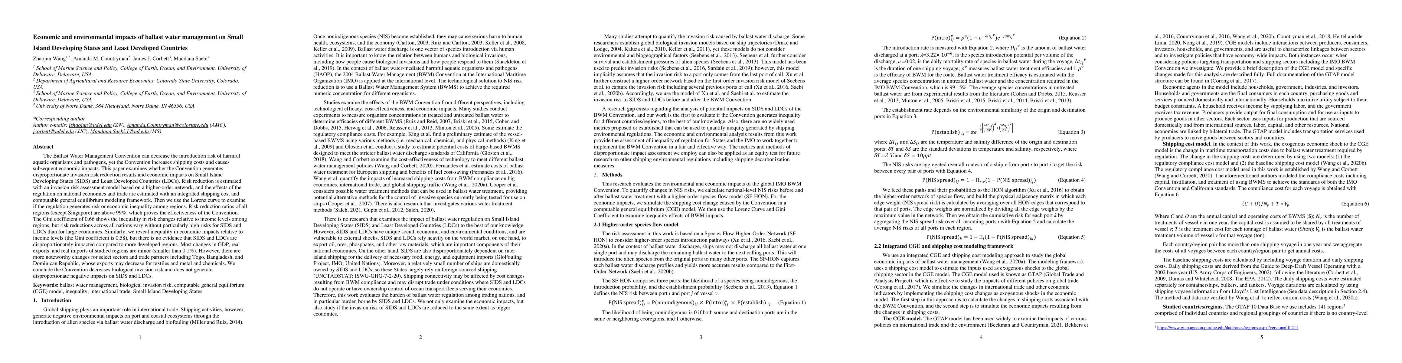 This paper evaluates the economic and environmental impacts of the Ballast Water Management Convention on Small Island Developing States (SIDS) and Least Developed Countries (LDCs). Despite the Convention's high effectiveness in reducing invasion risk (above 99% for all regions except Singapore), it does not disproportionately affect SIDS and LDCs economically or environmentally compared to larger economies, as indicated by minor changes in GDP and trade.