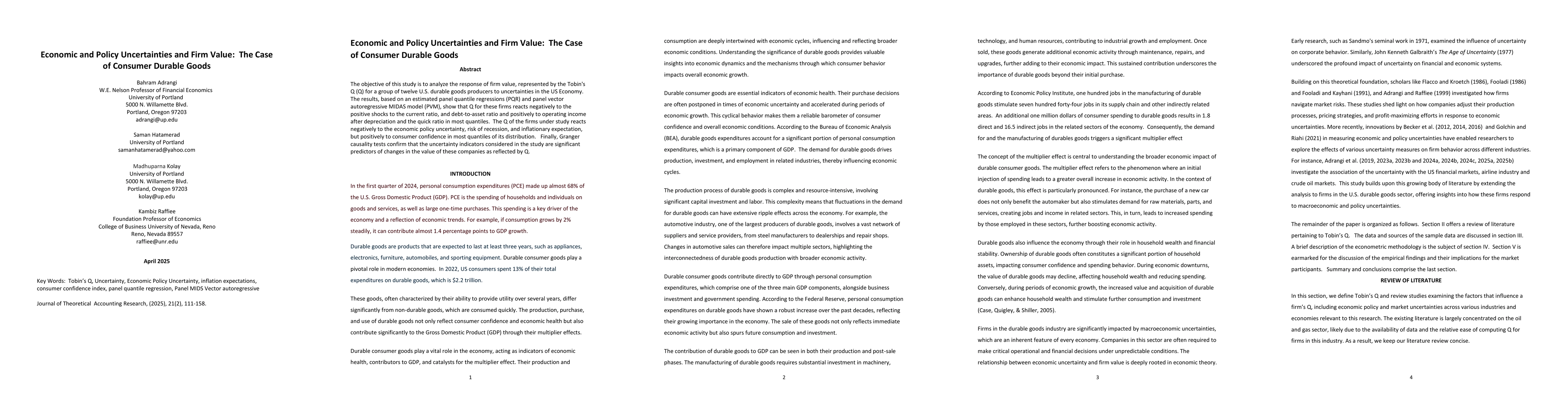 The objective of this study is to analyze the response of firm value, represented by the Tobin's Q (Q) for a group of twelve U.S. durable goods producers to uncertainties in the US Economy. The results, based on an estimated panel quantile regressions (PQR) and panel vector autoregressive MIDAS model (PVM), show that Q for these firms reacts negatively to the positive shocks to the current ratio, and debt-to-asset ratio and positively to operating income after depreciation and the quick ratio in most quantiles. The Q of the firms under study reacts negatively to the economic policy uncertainty, risk of recession, and inflationary expectation, but positively to consumer confidence in most quantiles of its distribution. Finally, Granger causality tests confirm that the uncertainty indicators considered in the study are significant predictors of changes in the value of these companies as reflected by Q.