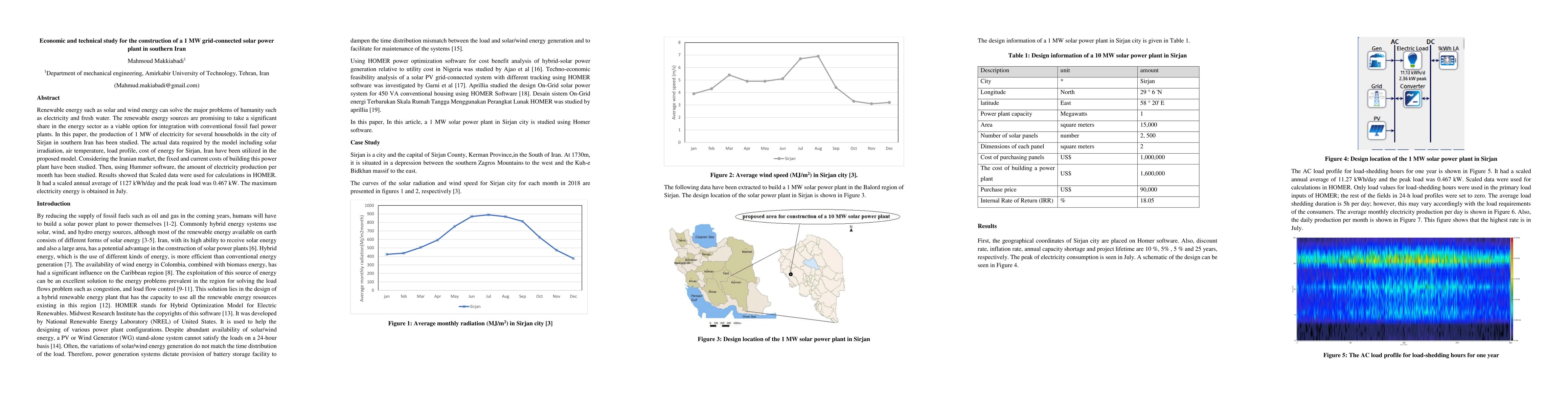 Renewable energy such as solar and wind energy can solve the major problems of humanity such as electricity and fresh water. The renewable energy sources are promising to take a significant share in the energy sector as a viable option for integration with conventional fossil fuel power plants. In this paper, the production of 1 MW of electricity for several households in the city of Sirjan in southern Iran has been studied. The actual data required by the model including solar irradiation, air temperature, load profile, cost of energy for Sirjan, Iran have been utilized in the proposed model. Considering the Iranian market, the fixed and current costs of building this power plant have been studied. Then, using Hummer software, the amount of electricity production per month has been studied. Results showed that Scaled data were used for calculations in HOMER. It had a scaled annual average of 1127 kWh/day and the peak load was 0.467 kW. The maximum electricity energy is obtained in July.