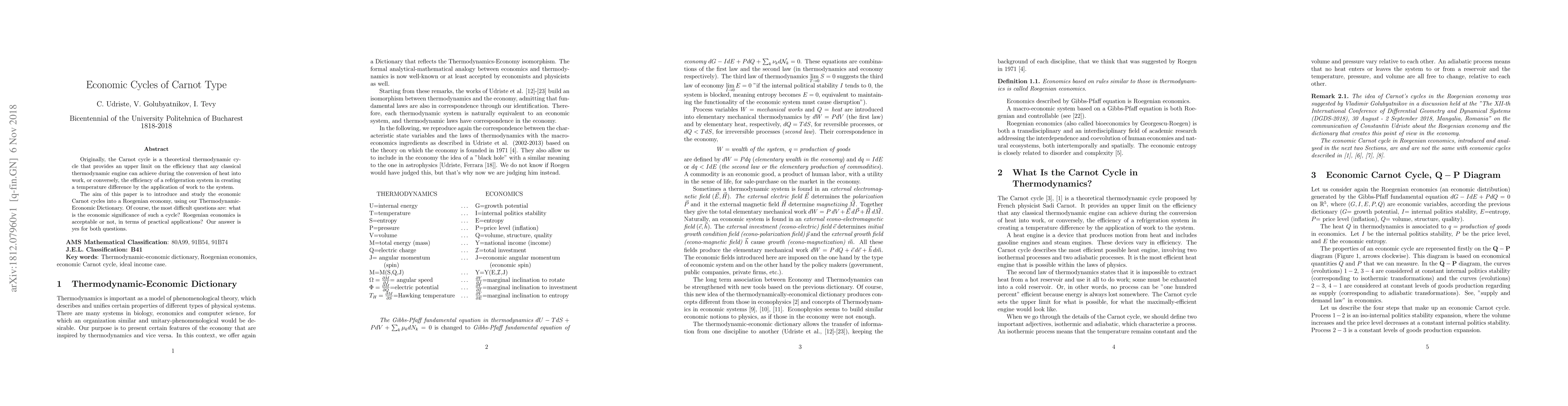 Originally, the Carnot cycle is a theoretical thermodynamic cycle that provides an upper limit on the efficiency that any classical thermodynamic engine can achieve during the conversion of heat into work, or conversely, the efficiency of a refrigeration system in creating a temperature difference by the application of work to the system. The aim of this paper is to introduce and study the economic Carnot cycles into a Roegenian economy, using our Thermodynamic-Economic Dictionary. Of course, the most difficult questions are: what is the economic significance of such a cycle? Roegenian economics is acceptable or not, in terms of practical applications? Our answer is yes for both questions.