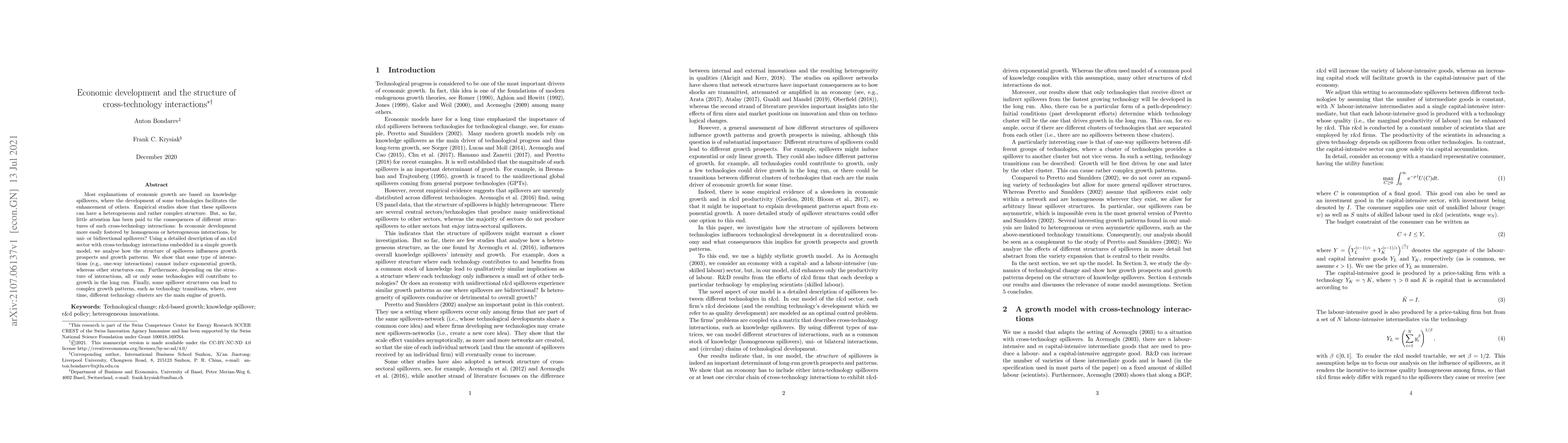 Most explanations of economic growth are based on knowledge spillovers, where the development of some technologies facilitates the enhancement of others. Empirical studies show that these spillovers can have a heterogeneous and rather complex structure. But, so far, little attention has been paid to the consequences of different structures of such cross-technology interactions: Is economic development more easily fostered by homogenous or heterogeneous interactions, by uni- or bidirectional spillovers? Using a detailed description of an r&d sector with cross-technology interactions embedded in a simple growth model, we analyse how the structure of spillovers influences growth prospects and growth patterns. We show that some type of interactions (e.g., one-way interactions) cannot induce exponential growth, whereas other structures can. Furthermore, depending on the structure of interactions, all or only some technologies will contribute to growth in the long run. Finally, some spillover structures can lead to complex growth patterns, such as technology transitions, where, over time, different technology clusters are the main engine of growth.
