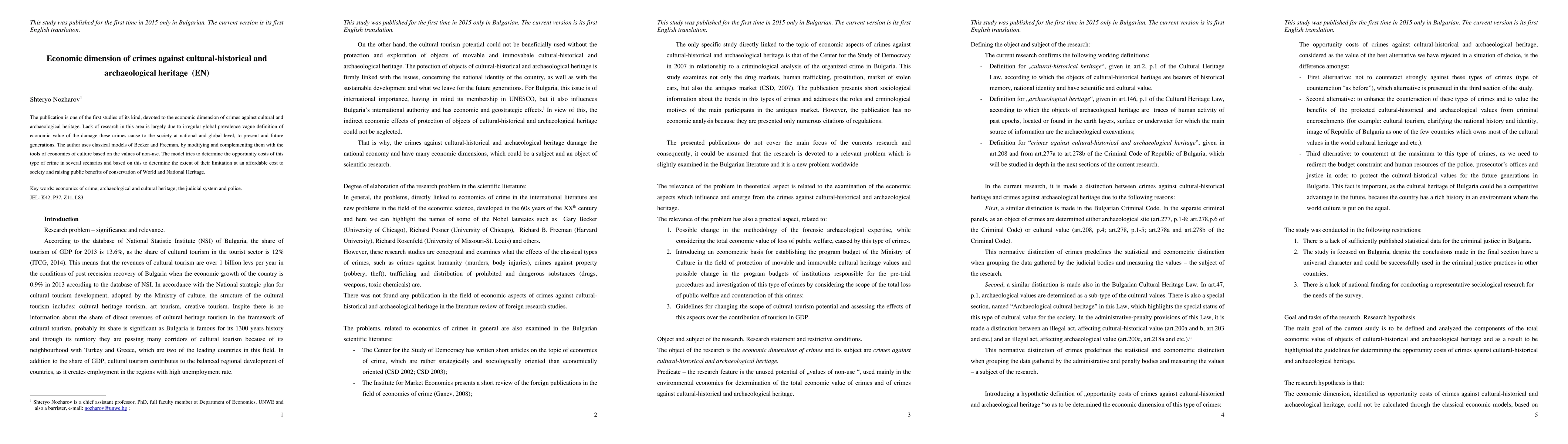 The publication is one of the first studies of its kind, devoted to the economic dimension of crimes against cultural and archaeological heritage. Lack of research in this area is largely due to irregular global prevalence vague definition of economic value of the damage these crimes cause to the society at national and global level, to present and future generations. The author uses classical models of Becker and Freeman, by modifying and complementing them with the tools of economics of culture based on the values of non-use. The model tries to determine the opportunity costs of this type of crime in several scenarios and based on this to determine the extent of their limitation at an affordable cost to society and raising public benefits of conservation of World and National Heritage.