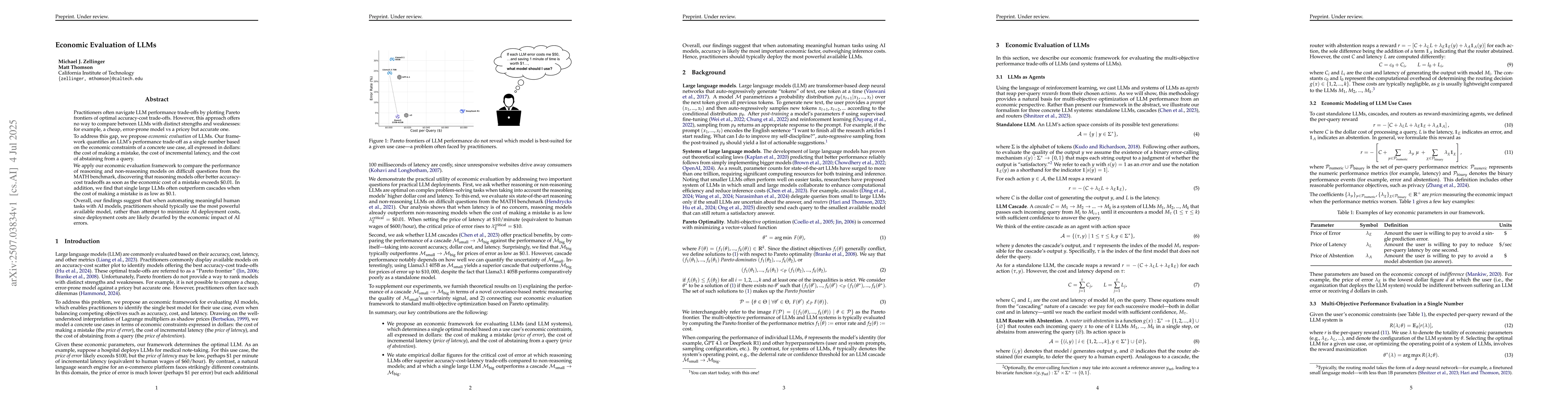 Practitioners often navigate LLM performance trade-offs by plotting Pareto frontiers of optimal accuracy-cost trade-offs. However, this approach offers no way to compare between LLMs with distinct strengths and weaknesses: for example, a cheap, error-prone model vs a pricey but accurate one. To address this gap, we propose economic evaluation of LLMs. Our framework quantifies the performance trade-off of an LLM as a single number based on the economic constraints of a concrete use case, all expressed in dollars: the cost of making a mistake, the cost of incremental latency, and the cost of abstaining from a query. We apply our economic evaluation framework to compare the performance of reasoning and non-reasoning models on difficult questions from the MATH benchmark, discovering that reasoning models offer better accuracy-cost tradeoffs as soon as the economic cost of a mistake exceeds \$0.01. In addition, we find that single large LLMs often outperform cascades when the cost of making a mistake is as low as \$0.1. Overall, our findings suggest that when automating meaningful human tasks with AI models, practitioners should typically use the most powerful available model, rather than attempt to minimize AI deployment costs, since deployment costs are likely dwarfed by the economic impact of AI errors.