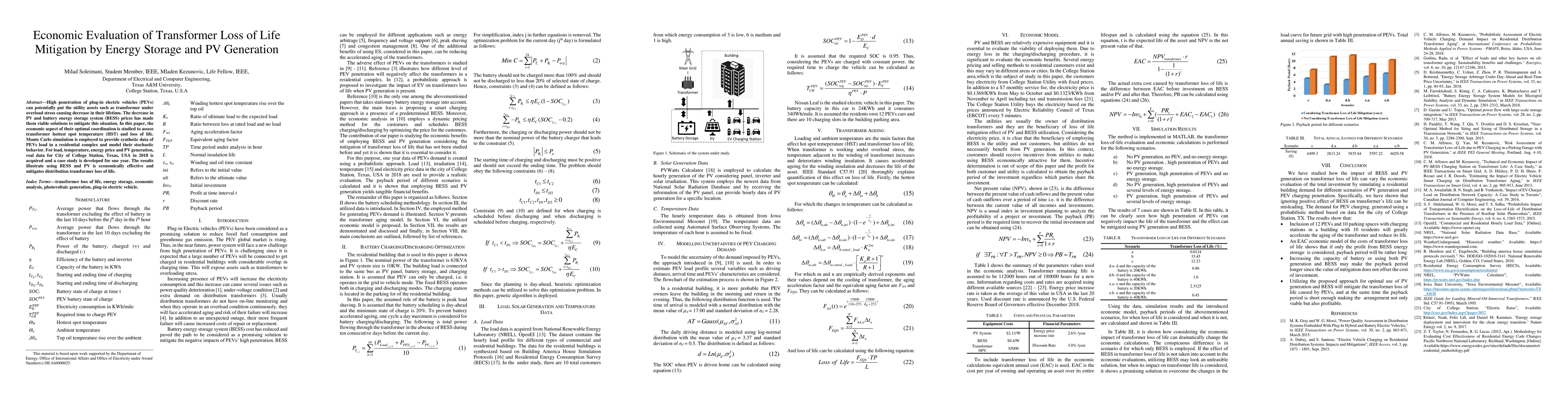 High penetration of plug-in electric vehicles (PEVs) can potentially put the utility assets such as transformer under overload stress causing decrease in their lifetime. The decrease in PV and battery energy storage system (BESS) prices has made them viable solutions to mitigate this situation. In this paper, the economic aspect of their optimal coordination is studied to assess transformer hottest spot temperature (HST) and loss of life. Monte Carlo simulation is employed to provide synthetic data of PEVs load in a residential complex and model their stochastic behavior. For load, temperature, energy price and PV generation, real data for City of College Station, Texas, USA in 2018 is acquired and a case study is developed for one year. The results illustrate using BESS and PV is economically effective and mitigates distribution transformer loss of life.